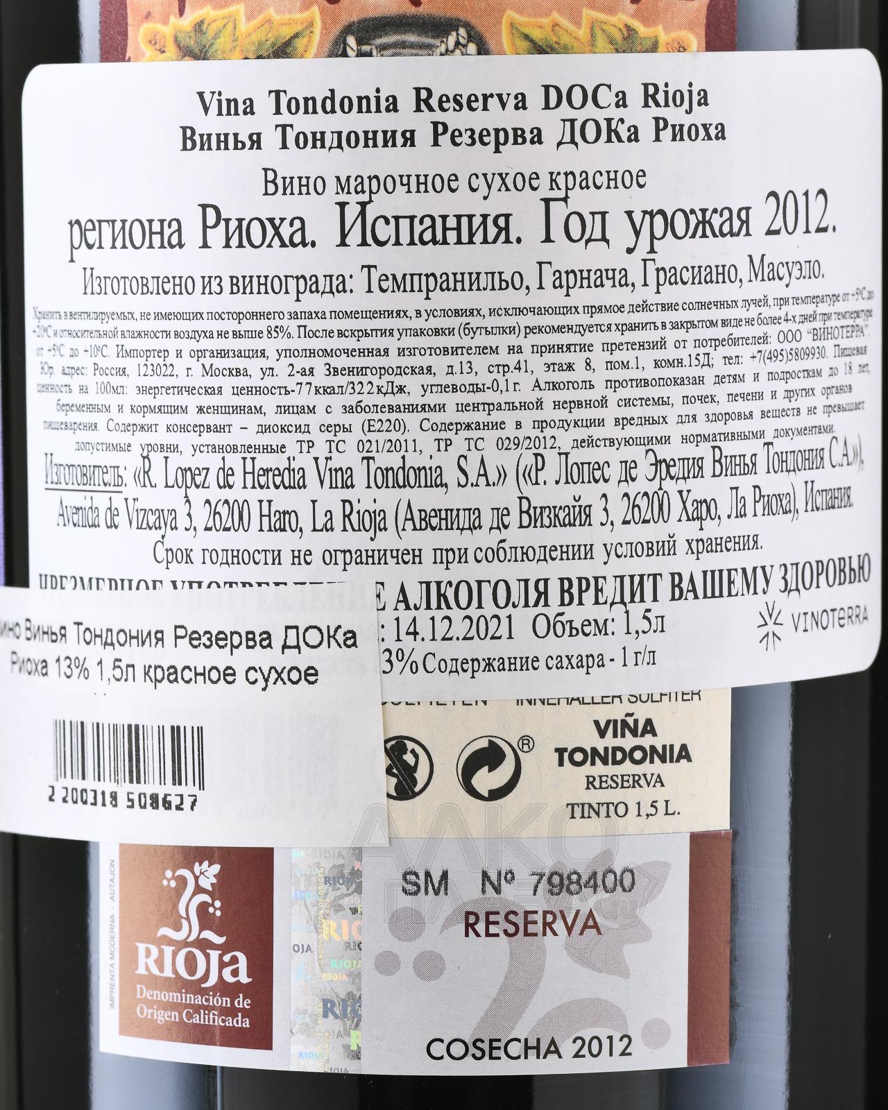Вино Vina Tondonia Reserva Rioja DOCa производилось на одном из старейших хозяйств Риохи, основанном в XIX веке. Урожай собирался вручную на склонах, где сочетались глинисто-известняковые почвы и умеренный климат с влиянием Атлантики. Виноград выдерживался традиционным методом: ферментация проходила в дубовых емкостях без применения современных технологий, что сохраняло характер терруара. Созревание осуществлялось в бочках из американского дуба на протяжении шести лет с регулярным переливом и фильтрацией вручную, а затем напиток отдыхал в бутылке, набирая мягкости и сложной гармонии. Такой подход придавал напитку неповторимую структуру и изысканный букет, который ценится знатоками по всему миру.