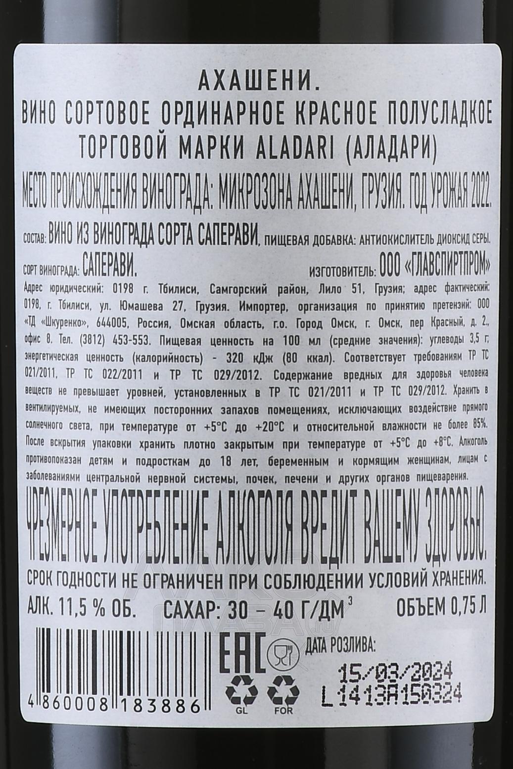 Красное полусладкое вино Аладари ГСП Ахашени 0,75 л — выразительный образец традиционного грузинского виноделия. Изготовлено исключительно из винограда сорта Саперави, выращенного в микрозоне Ахашени в Гурджаанском районе Кахетии. Виноградники расположены на высоте примерно 460 метров над уровнем моря. Климатические условия зоны позволили собрать ягоды с высокой сахаристостью – более 24 °Brix. Это, а также традиционная технология частичной ферментации и остановки брожения путём охлаждения, обеспечили напиток насыщенностью вкуса, мягкой естественной сладостью и выраженной кислотностью около 5–7 г/л.
