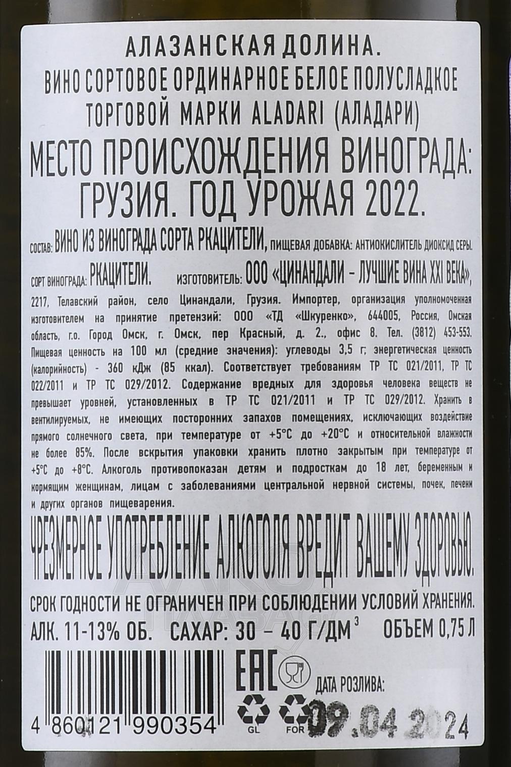 Белое полусладкое вино Аладари Алазанская долина Ркацители 0,75 л производится из ягод флагманского грузинского винограда. Сырье выращивают в известном винодельческом районе Грузии – Алазанской долине в Кахетии. Местный терруар отличается плодородными почвами, умеренным климатом и достаточным количеством солнечных дней. Это позволяет винограду полностью вызреть, сохранив при этом баланс сладости и кислотности. Урожай собирают преимущественно в октябре. Для региона характерны стабильные погодные условия – теплое, сухое лето и мягкая, осень без обильных дождей. Для сохранения естественной легкой сладости сусла брожение останавливают при достижении содержания сахара от 30 до 40 г/л.