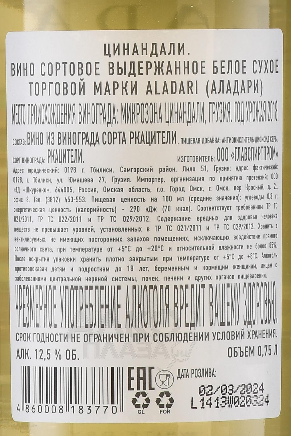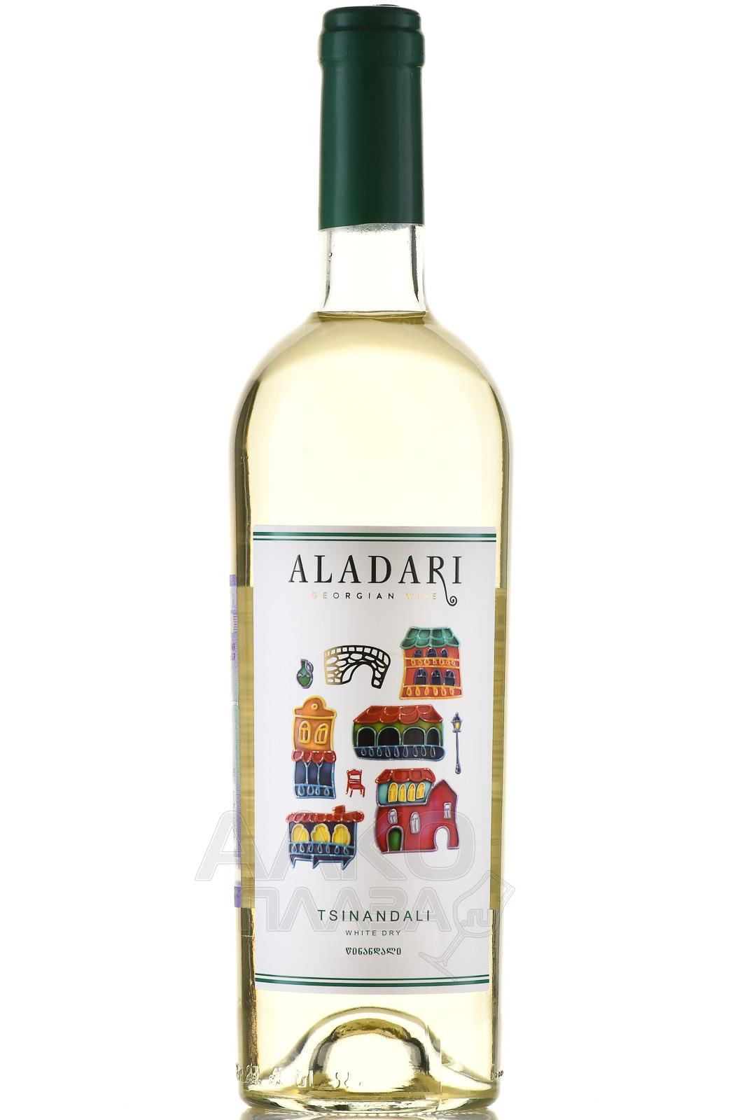 Белое сухое вино Аладари ГСП Цинандали 0,75 л – грузинский напиток родом из региона Кахетия, производимый в знаменитой винодельческой зоне Цинандали. В основе образца лежит классический кахетинский сорт винограда Ркацители, ягоды которого собирают вручную в конце сентября, когда их сахаристость достигает примерно 19%. Лозы произрастают на плодородных почвах у склонов горного хребта Гомбори на высоте от 300 до 750 метров над уровнем моря. Климат здесь умеренно влажный, лето жаркое с длительными солнечными периодами, а зима мягкая, без сильных заморозков. Сусло проходит ферментацию при низких температурах, после чего часть сброженного выдерживается до 8 месяцев в дубовых бочках.