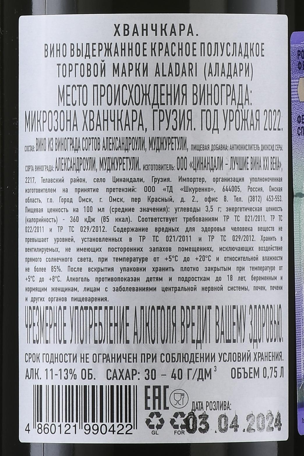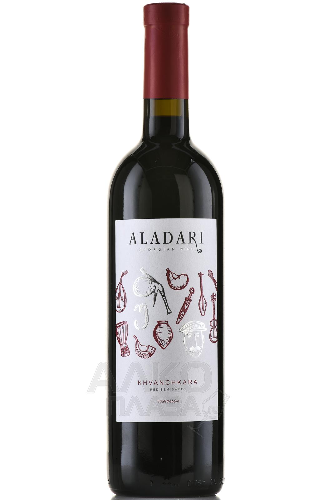 Красное полусладкое вино Аладари Хванчкара 0,75 л – напиток с выраженным грузинским характером. Его производят из традиционного купажа ягод Александроули и Муджуретули, выращенных в защищённой микрозоне Хванчкара в регионе Рача-Лечхуми. Виноградники расположены на высоте от 450 до 600 м на склонах Большого Кавказа, у правого берега реки Риони. Для местности характерны ясные солнечные дни и прохладные ночи, благодаря чему плоды достигают сахаристости выше 22% и сохраняют кислотность на уровне 6–7 г/л. Брожение проходит при температуре 28-32°С, после чего процесс останавливают охлаждением для сохранения естественной сладости и свежей кислотности. Выдержка в дубовых бочках делает вкус бленда мягким и округлым, а аромат наделяет яркими фруктовыми нотами с нежными пряными акцентами.