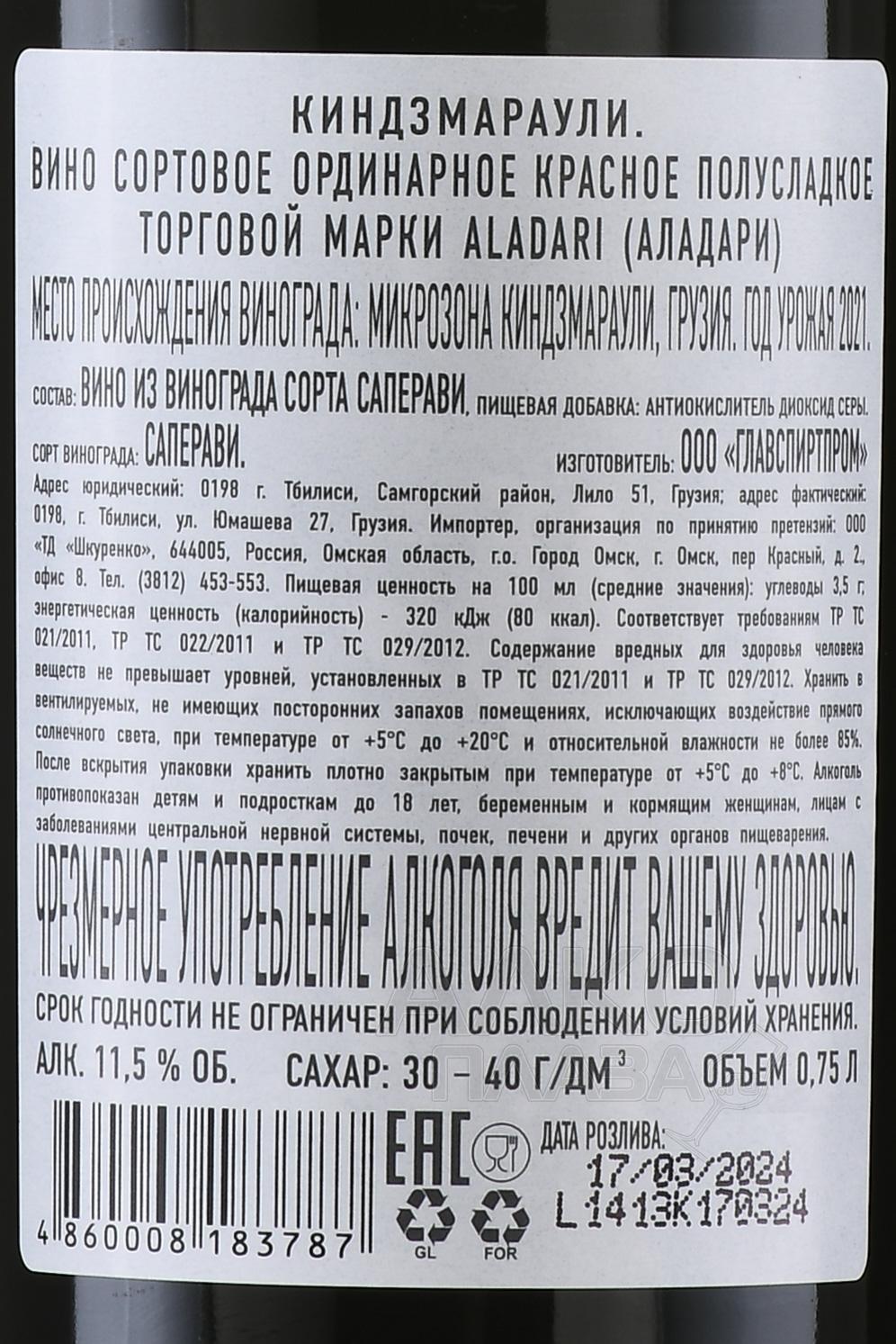 Красное полусладкое вино Аладари ГСП Киндзмараули 0,75 л – традиционный грузинский напиток, созданный из винограда главного местного сорта. Выращивают ягоды в уникальной микрозоне Киндзмараули, расположенной в долине реки Алазани. Здесь преобладают умеренно влажные условия с годовым количеством осадков около 600 мм. Почва каменистая, богатая минералами. Средние дневные температуры в сентябре составляют около 25 °C, ночные – около 12 °C, что обеспечивает идеальное созревание плодов. Урожай собирается вручную. Винификация проводится методом частичного брожения и остановки холодом, благодаря чему в образце сохраняется естественный остаточный сахар и свежесть фруктов. Созревание происходит в резервуарах из нержавеющей стали.