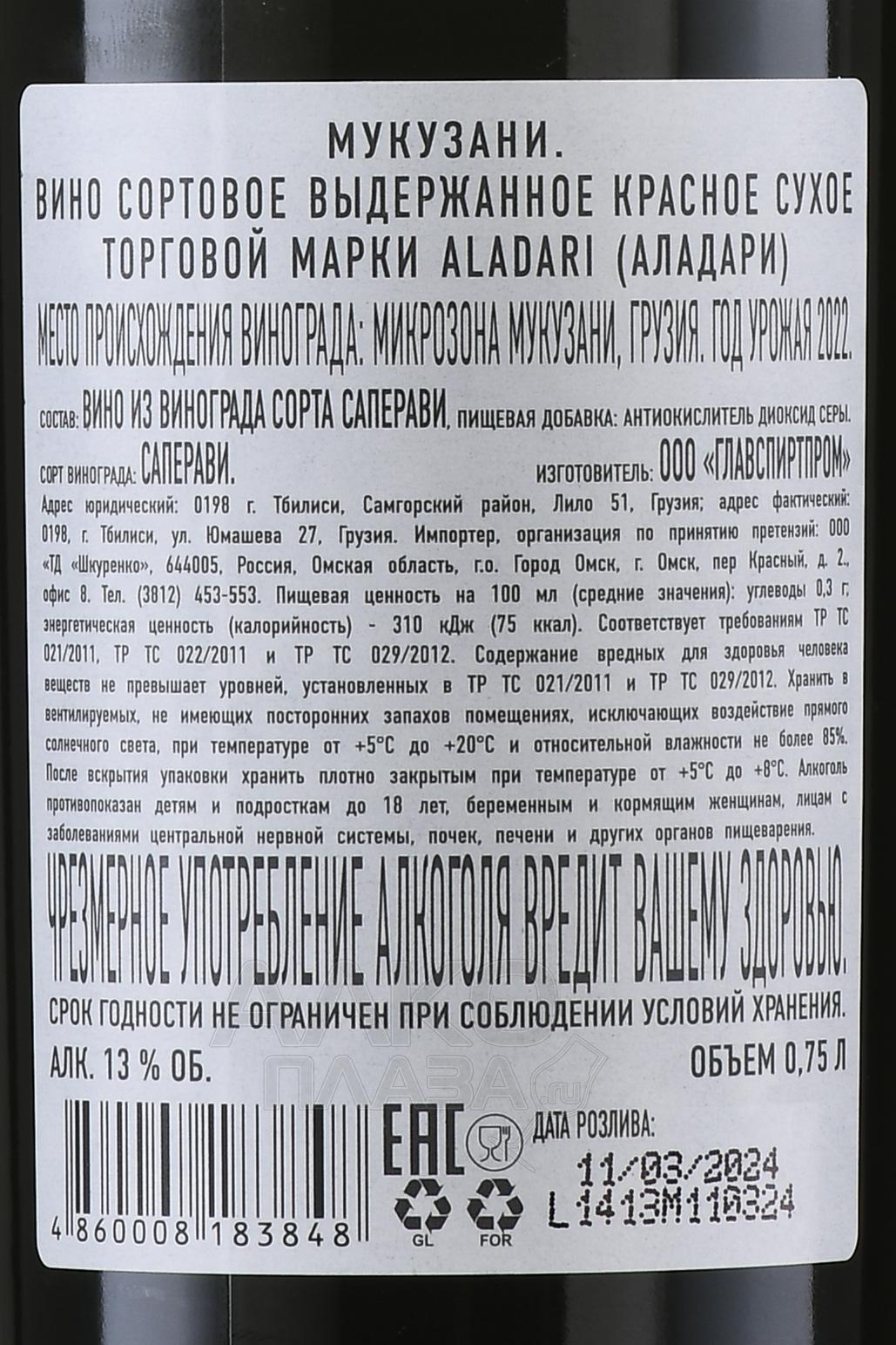 Красное сухое вино Аладари ГСП Мукузани 0,75 л – это выражение силы и яркости грузинского виноделия. Произведено из 100% Саперави – винограда с красной кожицей и мякотью, что придаёт напитку насыщенный рубиновый цвет. Сырьё растёт в терруаре Мукузани — на правом берегу реки Алазан в долине Кахети, на высоте 350–700 м над уровнем моря. Почвы здесь — смесь аллювиальных, лесных и делювиальных, обеспечивающих хороший дренаж. Климат умеренно континентальный: мягкая влажная зима, жаркое влажное лето и прохладные ночи, которые позволяют ягодам накопить сахар и фенолы. Сбор обычно в начале октября при минимальной сахаристости 19 °Brix. После ферментации напиток выдерживают минимум 12 месяцев в дубовых бочках, что добавляет ему структуру и сложность.