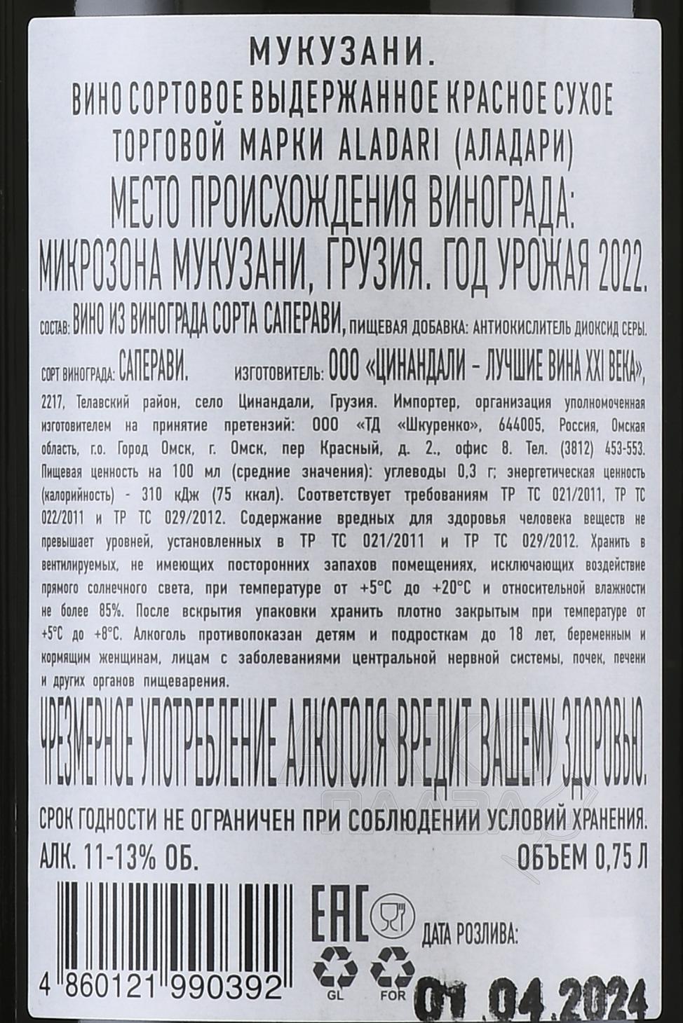 Красное сухое вино Аладари Мукузани 0,75 л – это напиток с выраженным характером из одноимённой микрозоны в регионе Кахетия. Моносорт изготовлен из ягод автохтонного винограда Саперави, произрастающего в холмистом терруаре на высоте около 450 метров. Почва здесь богата глиной и известняком, что обеспечивает плодам насыщенность вкуса и высокую кислотность. Сырьё созревало в условиях умеренно тёплого лета с достаточным количеством осадков и стабильной дневной температурой около +27 °C. После ручного сбора грозди очистили от стеблей, сортировали и отправили на ферментацию. Затем сусло выдерживалось в дубовых бочках.
