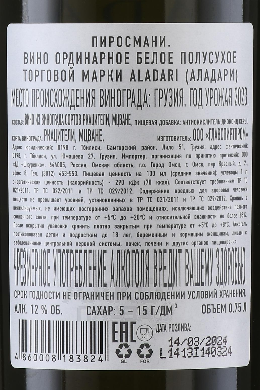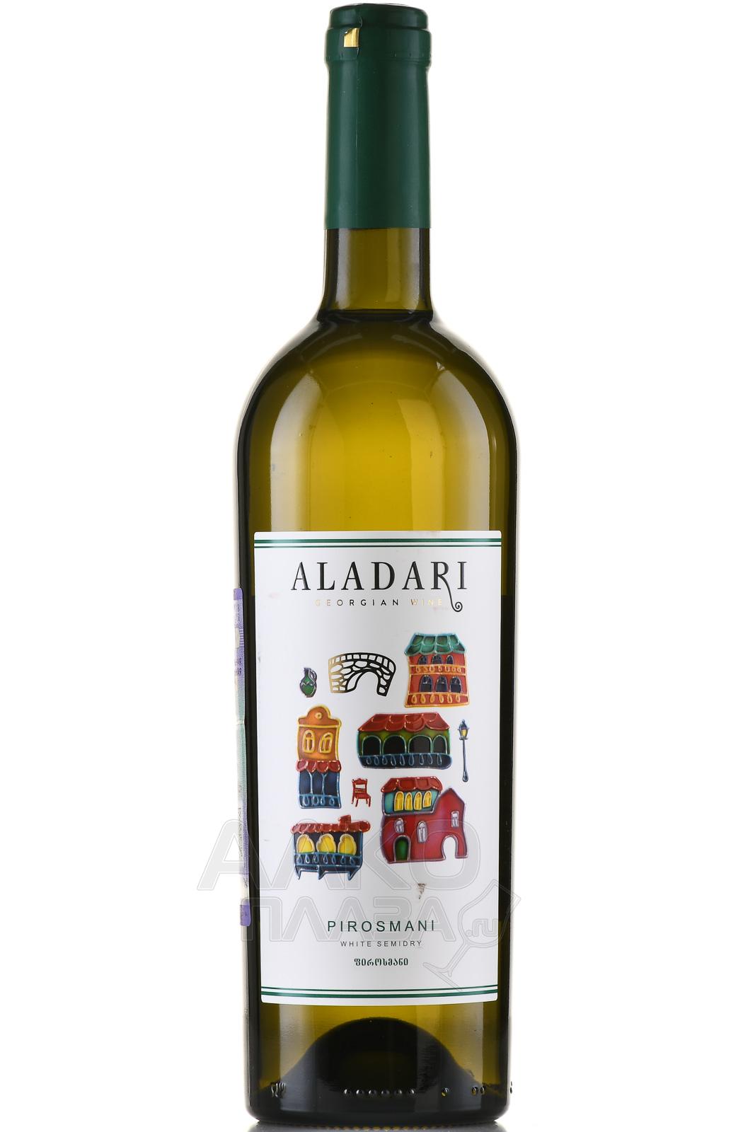 Белое полусухое вино Аладари ГСП Пиросмани 0,75 л – образец классического грузинского виноделия из региона Кахетия. Производится из винограда, выращенного в знаменитой Алазанской долине, характеризующейся мягким климатом, умеренным количеством осадков и плодородными почвами. Тёплое солнечное лето обеспечило хорошее созревание ягод и оптимальный баланс сахаров и кислот. На винификацию пошли плоды традиционных местных сортов Ркацители и Мцване. Брожение проходило в ёмкостях при низких температурах и останавливалось охлаждением, благодаря чему сохранились природная сладость и свежесть напитка.