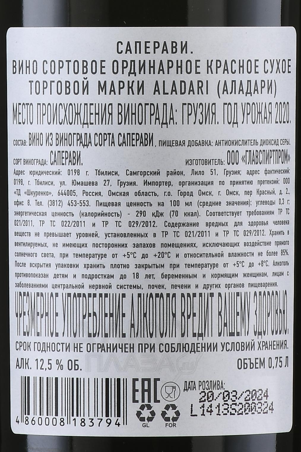 Красное сухое вино Аладари ГСП Саперави 0,75 л создаётся из винограда, произрастающего в сердце Грузии — Кахетии, в долине Алазани у подножья Великого Кавказа. Почвы здесь — богатый минералами аллювий речного происхождения и песчаные глины, что вместе с континентальным климатом — жарким сухим летом и прохладной влажной осенью — дают ягодам интенсивный цвет и плотную структуру. Урожай, собранный в начале октября при высокой сахаристости — до 24 °Brix, ферментировали при контролируемой температуре, а затем выдержали в дубовых бочках минимум в течение 6 месяцев для получения сбалансированной структуры с легкими древесными нюансами.