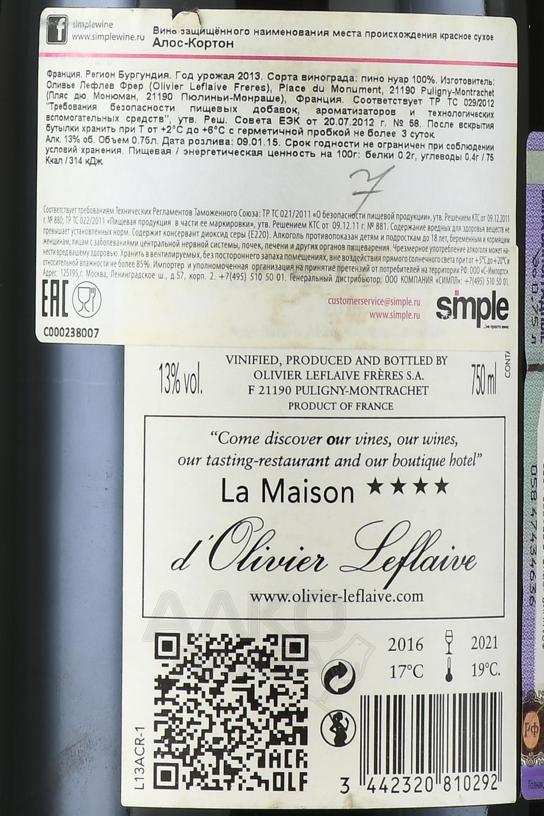 Красное сухое вино Olivier Leflaive Aloxe-Corton 0,75 л - напиток, для изготовления которого используются отборные ягоды, собираемые в престижной деревне Алокс-Кортон с лоз возрастом 30 лет. Урожай после сбора проходит сортировку и подвергается прессованию с последующей винификацией, которая протекает 23 дня. Созревание готового вина проходило в бочках из французского дуба в течение 18 месяцев, причем 30% бочек ранее не использовались.