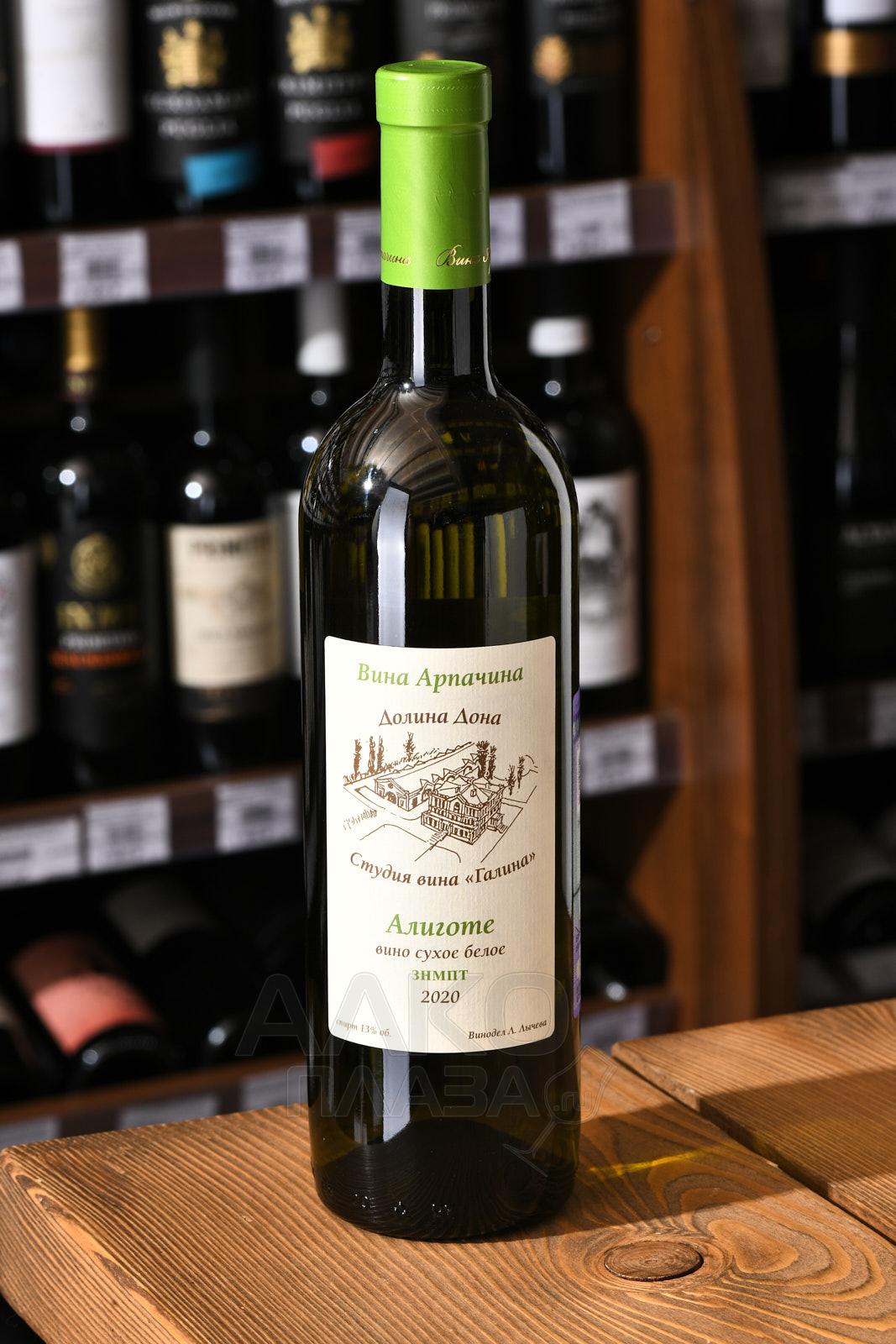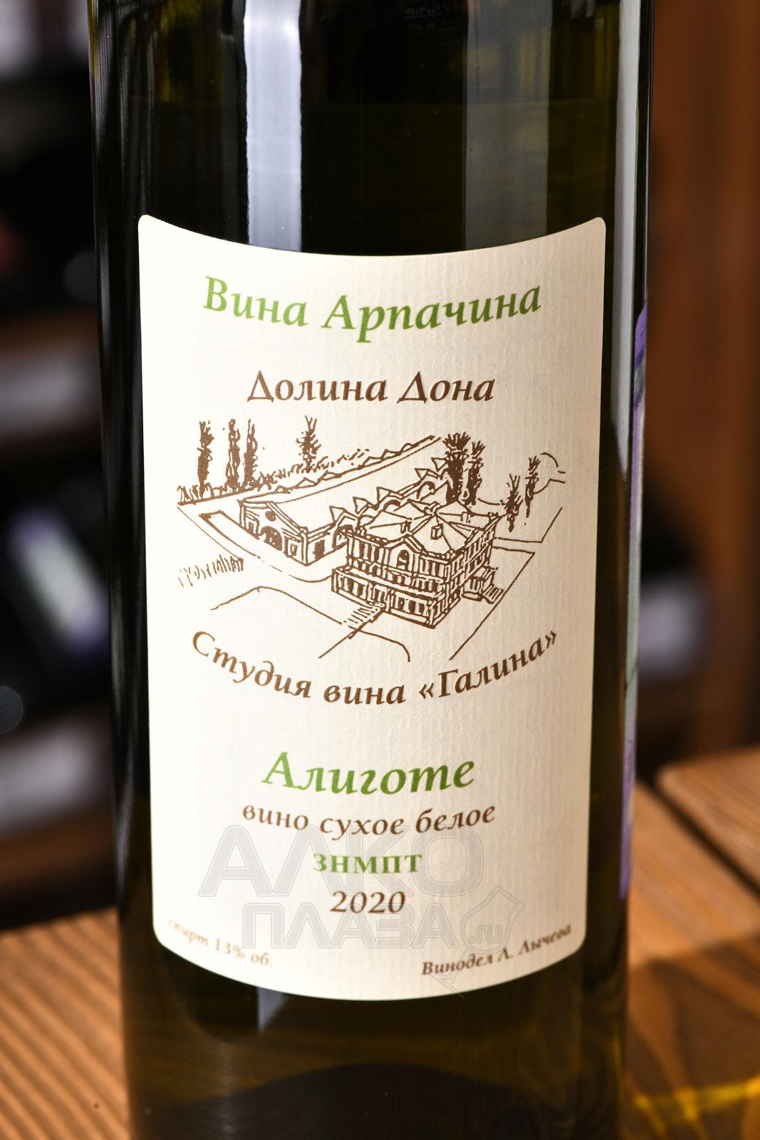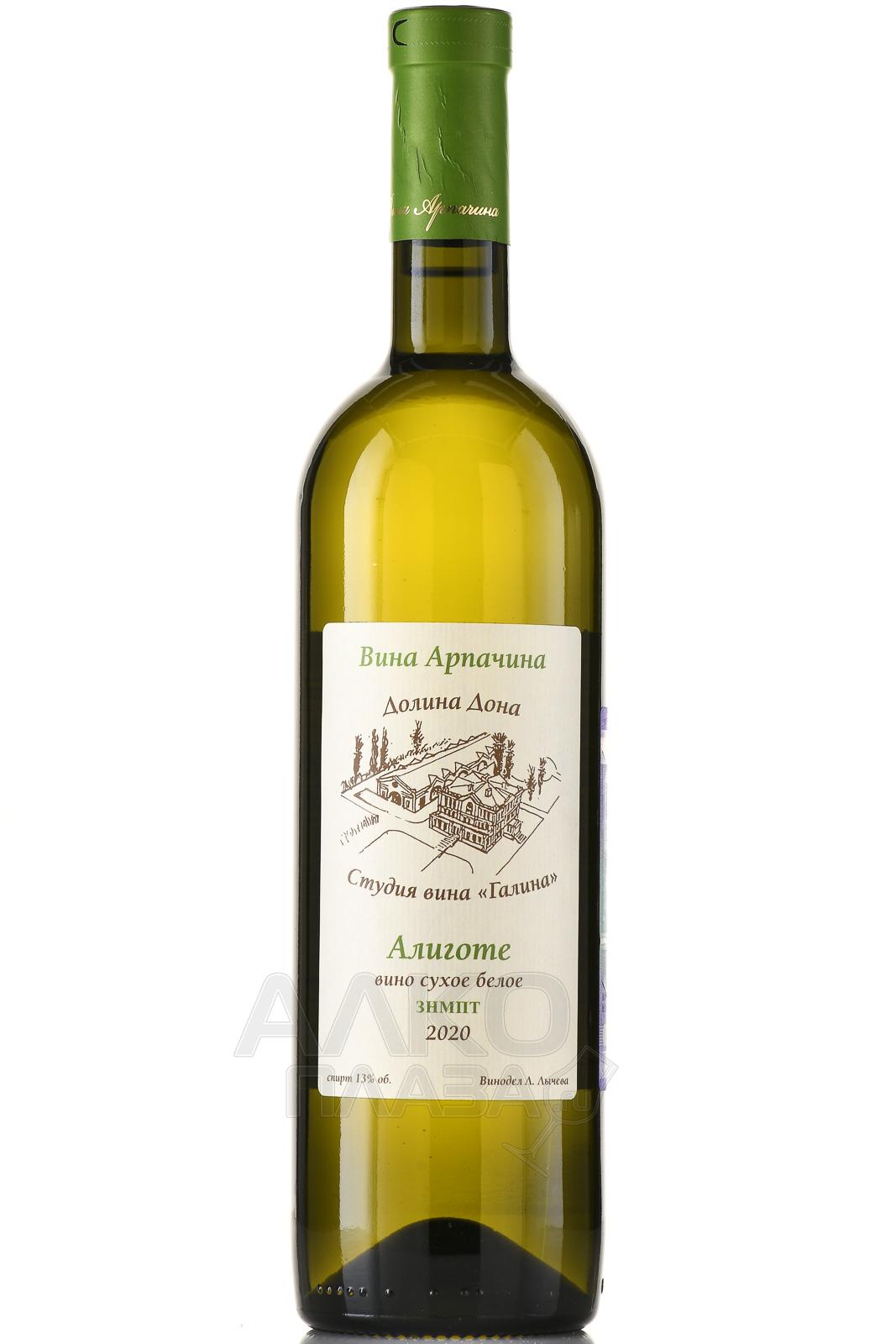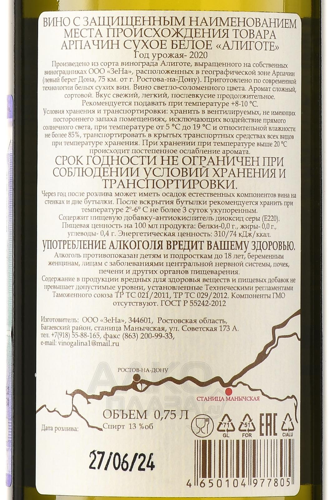 Белое сухое вино Арпачин Алиготе 2020 г. 0,75 л произведено из урожая, собранного на южных склонах Ростовской области в районе хутора Арпачин. Виноградники заложены на известково-глинистых почвах с хорошей воздухопроницаемостью, что способствует накоплению кислотности в ягодах. В 2020 году лето было жарким и сухим, с минимальным количеством осадков, что позволило плодам полностью вызреть. Урожай собрали вручную в конце августа при стабильной температуре около +28 °C. Сбор осуществлялся рано утром, чтобы сохранить свежую органолептику сырья. После бережного прессования сусло ферментировали в нержавеющей стали при температуре 14–16 °C. Напиток не подвергали малолактическому брожению, чтобы сохранить его яркий сортовой характер.