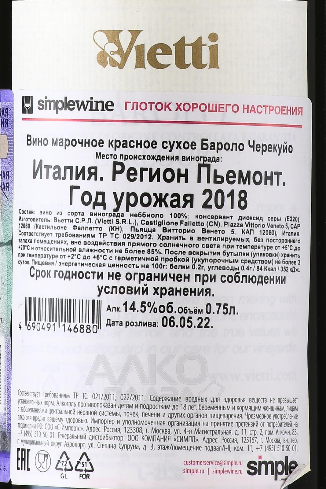 Barolo Cerequio Vietti - вино Бароло Черекуйо Вьетти 0,75 л красное сухое
