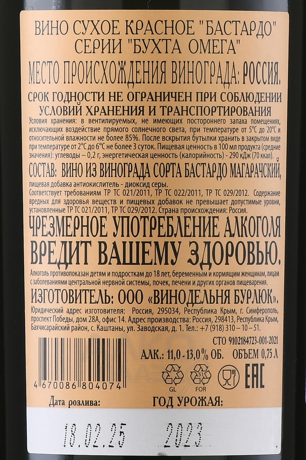 Красное сухое вино Бухта Омега Бастардо Валерий Захарьин 0,75 л создано из редкого сорта, который отличается насыщенным характером и богатой палитрой вкуса. Виноградники расположены в Крыму, на склонах с южной экспозицией, где мягкий морской климат и каменистые почвы обеспечивают особую сочность винограда и высокую концентрацию вкусоароматических веществ. Урожай собирают вручную, что позволяет отобрать только зрелые грозди. Ферментация проводится в стальных емкостях при контролируемой температуре, что сохраняет свежесть и чистоту вкуса. Выдержка проходит в дубовых бочках, благодаря чему вино приобретает сложные оттенки пряностей и легкие дубовые ноты.