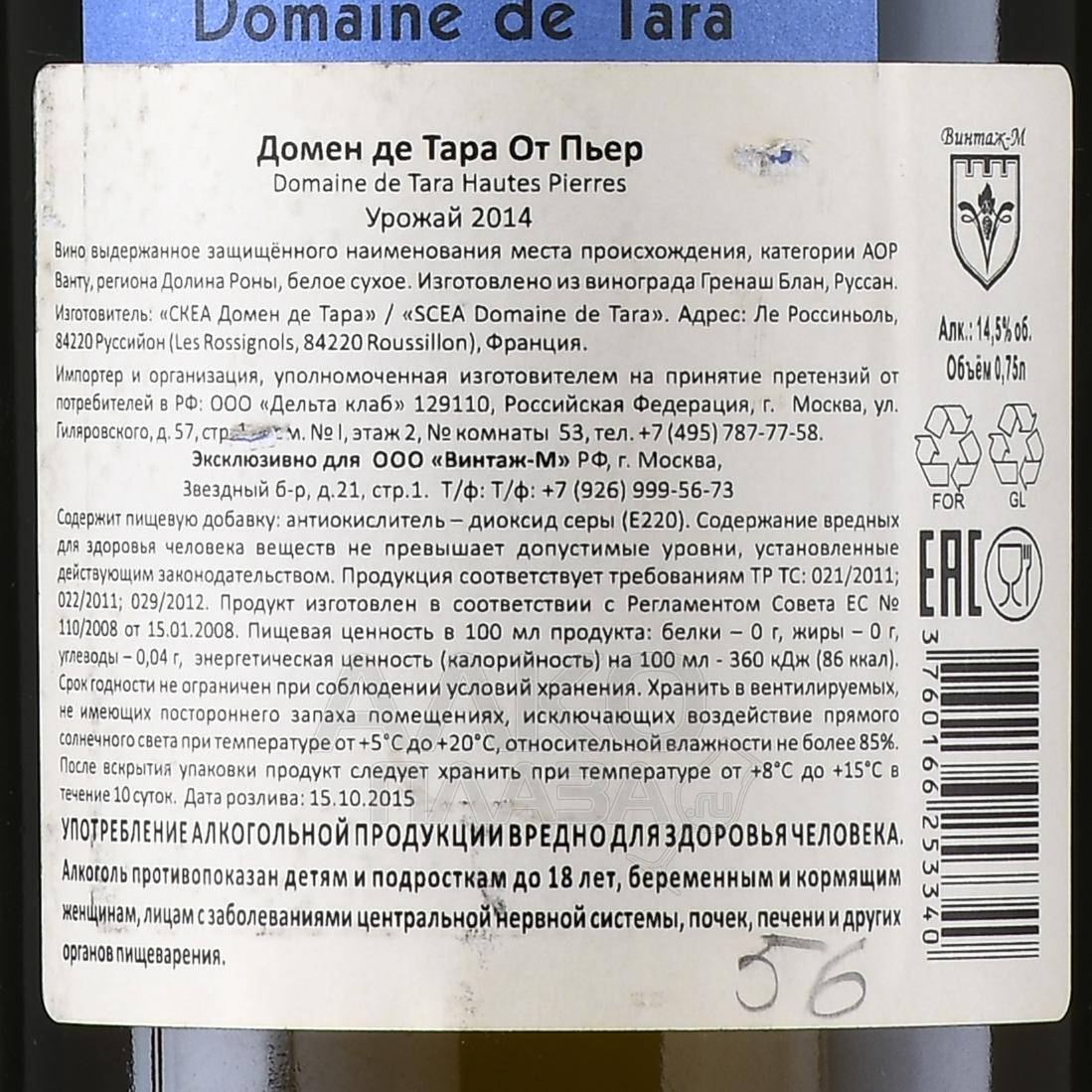 Domaine de Tara Hautes Pierres Blanc - вино Домен де Тара От Пьер Блан 0.75 л 2014 год белое сухое
