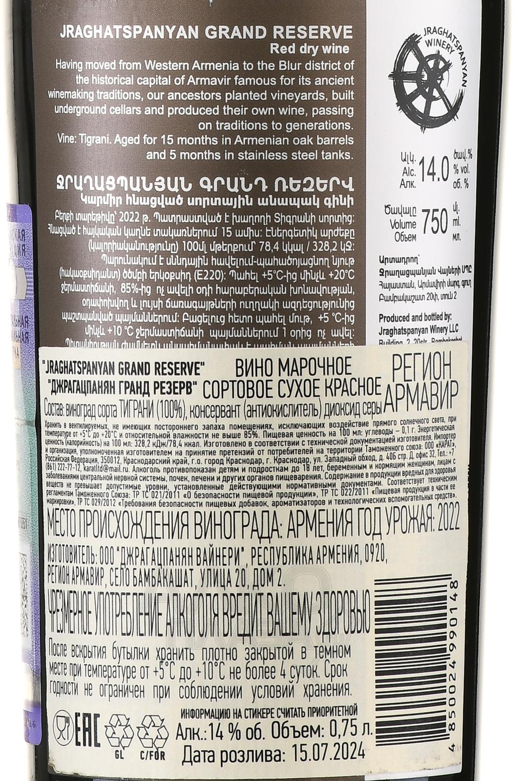 Красное сухое вино Джрагацпанян Гранд Резерв 0,75 л — премиальное армянское вино, созданное из автохтонного сорта винограда Тиграни. Ягоды произрастают в винодельческом регионе Армавир на высоте 1300–1450 метров над уровнем моря. Особенности терруара — бедные каменистые почвы с высоким содержанием известняка и выраженным перепадом дневных и ночных температур. Виноградники располагаются на южных склонах, что обеспечивает стабильное созревание винограда. Сбор урожая проводят вручную с последующим строгим отбором ягод. После винификации напиток выдерживается 15 месяца в армянском дубе и еще 5 месяцев — в стальных танках.