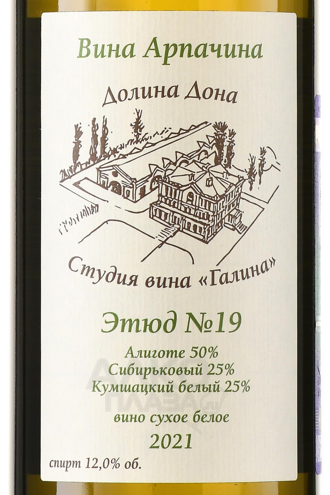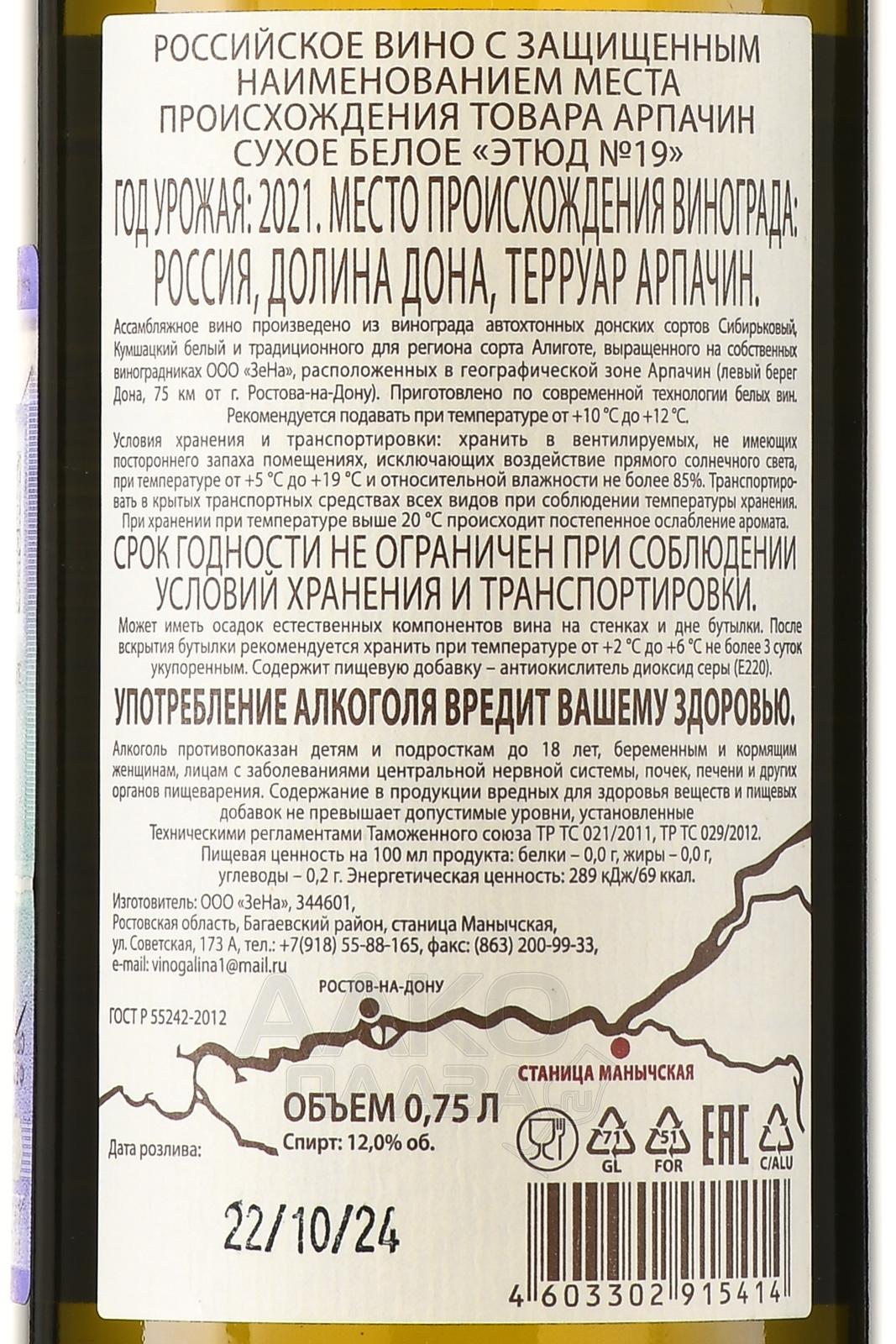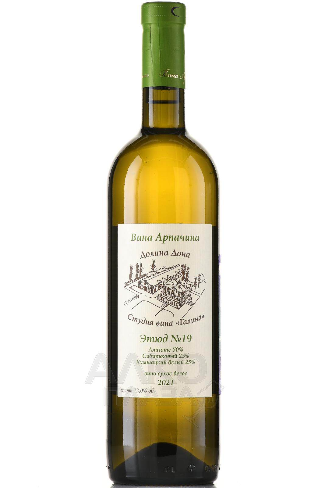 Белое сухое вино Этюд №19 Арпачин 2021 г. 0,75 л выпускает российская винодельня из Ростовской области – региона с континентальным климатом и умеренным количеством осадков. Особенность напитка заключается в уникальном купаже автохтонных светлокожих сортов винограда Сибирьковый и Кумшацкий белый, дополненных классическим Алиготе. Сырье собирали вручную в сентябре 2021 года, после сухого и теплого лета с минимальным количеством осадков, способствовавшего набору ягодами высокой сахаристости. Урожайность в тот сезон составила около 65 центнеров с гектара. После бережной сортировки плоды прошли мягкое прессование, а отжатый сок – ферментацию при контролируемой температуре 16–18 °C. Выдержка длилась шесть месяцев в емкостях из нержавеющей стали.
