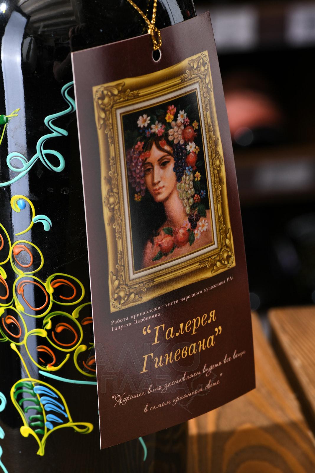 Красное сухое вино Галерея Гиневана 0,75 л – это столовая вариация армянского производства с оптимальным соотношением цены и качества. В винификации напитка участвуют местные сорта винограда. На завершающем этапе спиртное разливается в сувенирные бутылки из темного стекла, расписанные красочными изображениями.