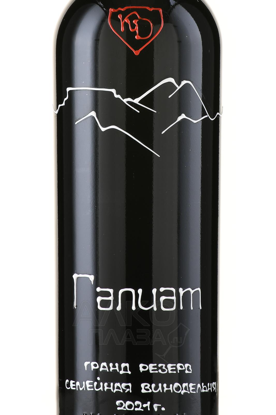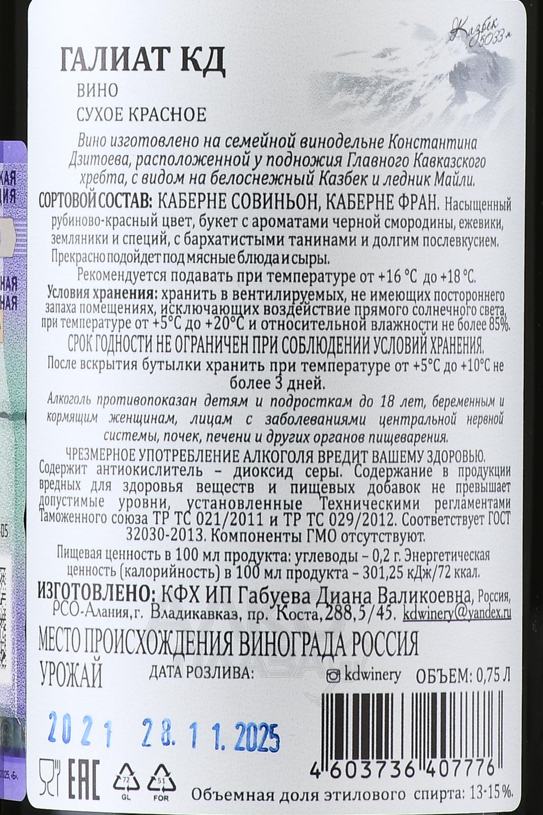 Красное сухое вино Галиат КД Гранд Резерв 0.75 л — качественный образец от семейной винодельни К. Дзитоева из Северной Осетии — Алании, созданный из сортов Каберне Совиньон и Каберне Фран и собранный в определенный год. Только спелый и неповрежденный урожай разрешается использовать в производстве. Ферментация проходит по классическому способу изготовления красных вин. Далее происходит выдержка в течение года в барриках из древесины дуба. Все бутылки мастера расписывают красками вручную, и нет ни одной одинаковой бутылки. Потенциал развития — от 3 до 4 лет.
