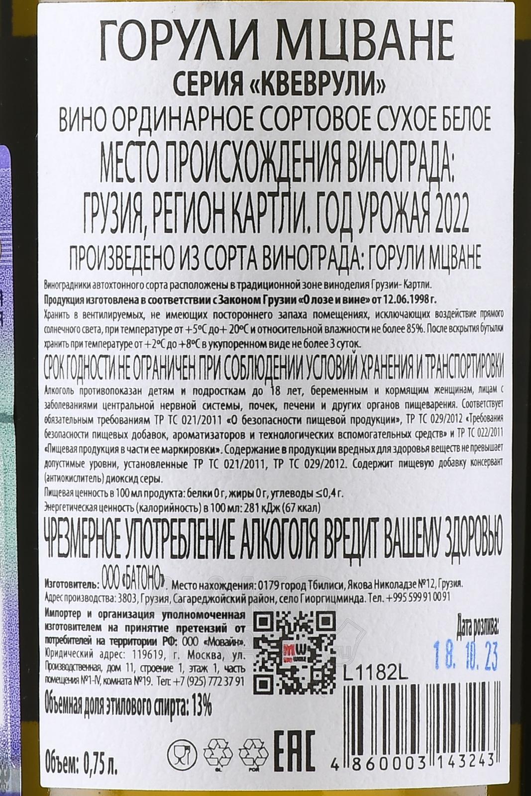 Белое сухое вино Qvevruli Goruli Mtsvane серия Квеврули 2019 г. 0,75 л изготовлено из уникального грузинского автохтона, который культивируется в традиционной зоне виноделия Картли. Название Горули Мцване можно перевести как «зеленый горский». То есть это светлокожий виноград с зеленоватым оттенком, который выращивается в гористой местности в условиях прохладного микроклимата. Вино из серии Квеврули создано по классической технологии с использованием глиняных кувшинов квеври.