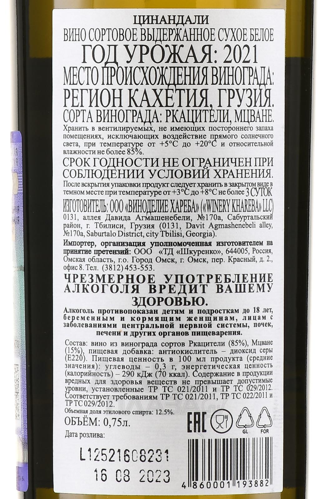 Вино Хареба Цинанадали 0.75 л белое сухое производится из отборного винограда сортов Ркацители и Мцване, выращенных в историческом винодельческом регионе Кахетия на востоке Грузии. Урожай собирают вручную, тщательно сортируя ягоды, после чего проводят ферментацию традиционным методом при контролируемой температуре в стальных емкостях, сохраняя природную свежесть и чистоту вкуса. Особенность терруара Цинандали заключается в уникальном сочетании плодородных известняковых почв и умеренного климата с выраженными перепадами температур между днем и ночью, что способствует формированию изысканной ароматики и сбалансированной кислотности напитка.
