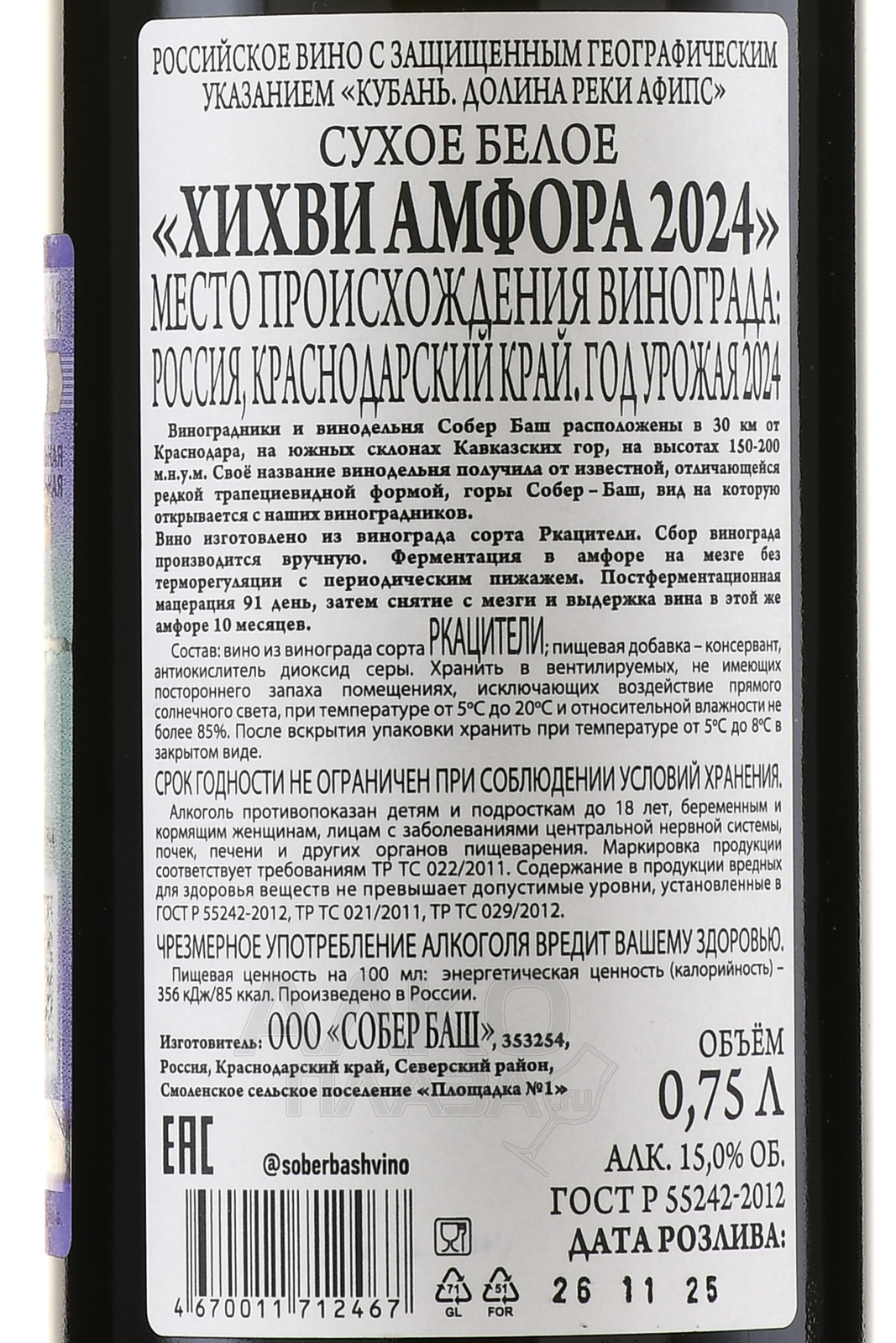 Белое сухое вино Хихви Амфора Собер Баш 2023 год 0,75 л содержит стопроцентный виноград автохтонной грузинской вариации, который собрали на лучших плантациях России с благоприятной южной экспозицией, расположенных в пределах Краснодарского края. Ягоды сорвали с лоз среднего возраста, произрастающих близ реки Афипс на участках высотой до 150-200 м над уровнем моря с плотностью посадки до пяти тысяч растений на один гектар. Винификация сусла осуществилась вместе с мезгой без контроля температурных показателей. Постферментационная мацерация длилась около трех месяцев. Выдержка осуществилась в амфорах, где вино провело по меньшей мере четыре месяца. Этот алкоголь выпустили лимитированной серией из 2600 бутылок.