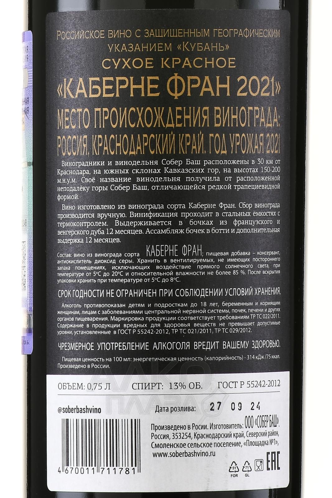 Красное сухое вино Каберне Фран Собер Баш 0,75 л произведено в долине реки Афипс в Краснодарском крае. Виноградники и сама винодельня расположены в 30 км от Краснодара. Лозы растут на южных склонах Кавказских гор на высоте 150–200 м. Отсюда хорошо видна гора Собер Баш, имеющая примечательную трапециевидную форму. Виноград сорта Каберне Фран собирали вручную при оптимальной зрелости. Винификация проходила в стальных емкостях с термоконтролем. Вино год выдерживалось в бочках из французского дуба, затем проводилась дополнительная выдержка в дубовом чане-ботти в течение 16 месяцев. Благодаря этому напиток приобрел сложный аромат и насыщенный вкус.