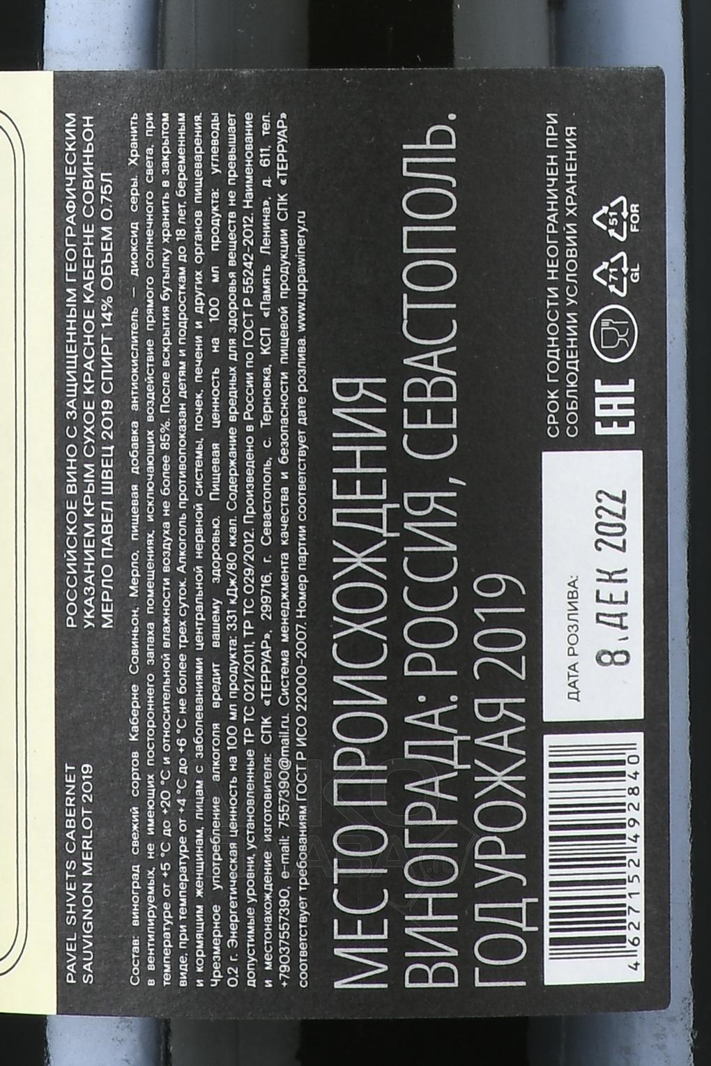 Вино Павел Швец Каберне Совиньон Мерло Черная Ривер Велли Клер Нуммулит 0,75 л — высококачественный напиток производства РФ в бордоском стиле, созданный крымской винодельней из двух европейских вариаций винограда. Его собрали в ограниченный сезон с плантаций высотой порядка 380 м над уровнем моря, сложенных известняковыми породами. Спелые ягоды обработали посредством ферментации в стальных цистернах и выдержки во французских дубовых бочках сроком 32 месяца. Спиртуозность вина составляет 14%. Его потенциал к хранению достигает 15 лет.