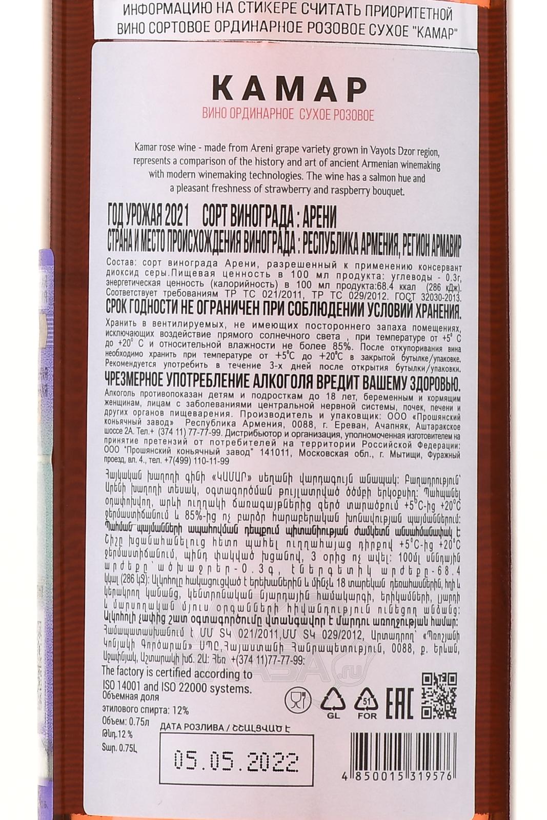 Розовое сухое вино Kamar 2021 г. 0,75 л — миллезимный напиток из винограда красного армянского автохтона, выращенного в регионе Вайоцдзор. Терруар известен своими высокогорными виноградниками, где климатические условия способствуют медленному созреванию ягод. Сырье выросло в благоприятных погодных условиях с умеренными температурами и достаточным количеством осадков. Винификация проходила по распространенной технологии кратковременной мацерации и ферментации сусла при контролируемой низкой температуре.