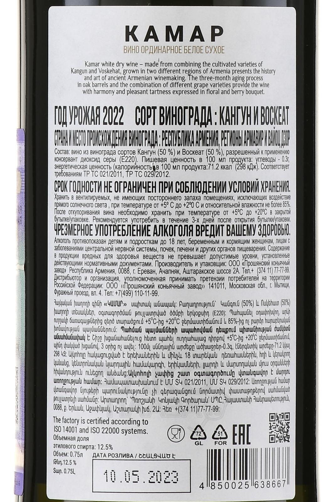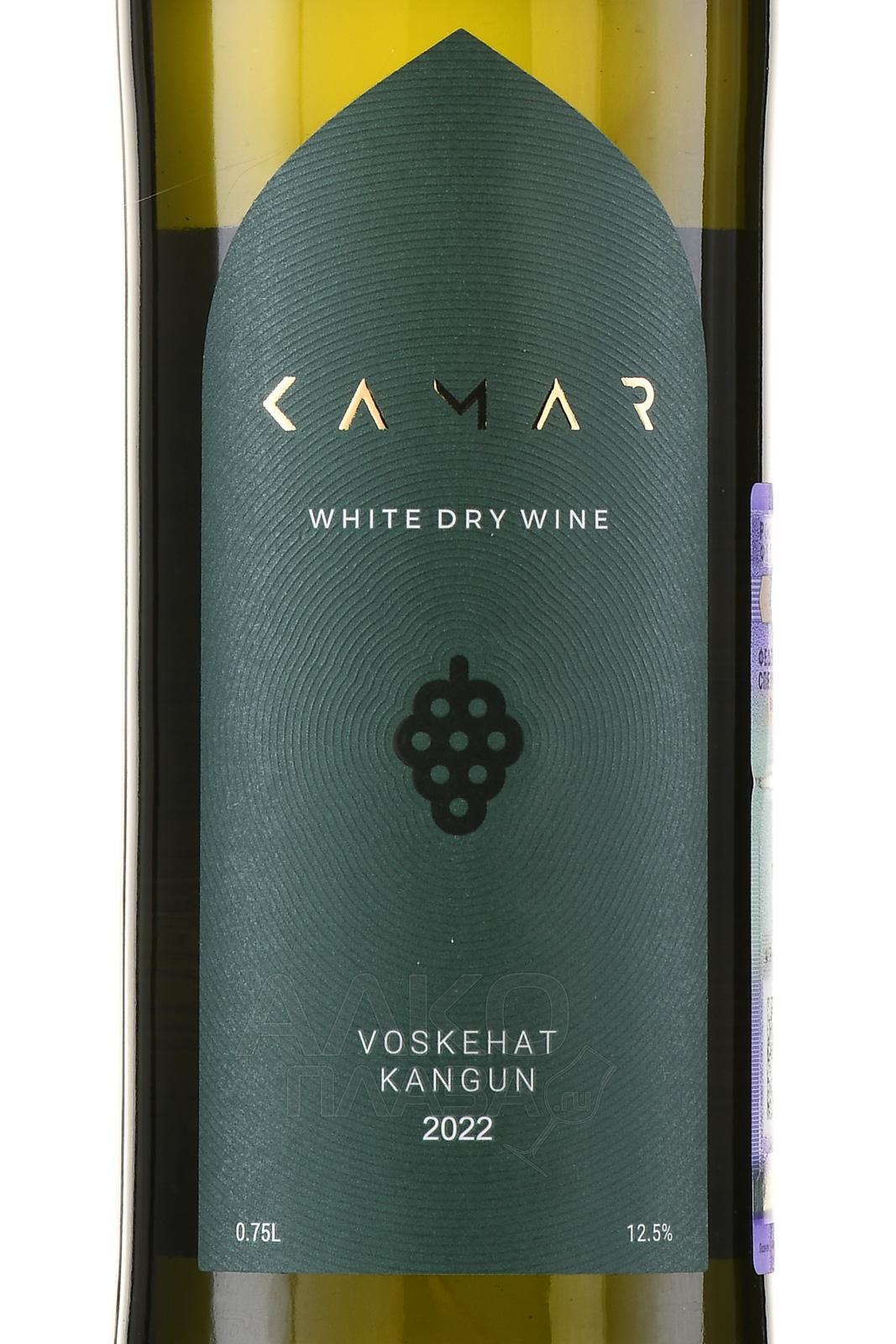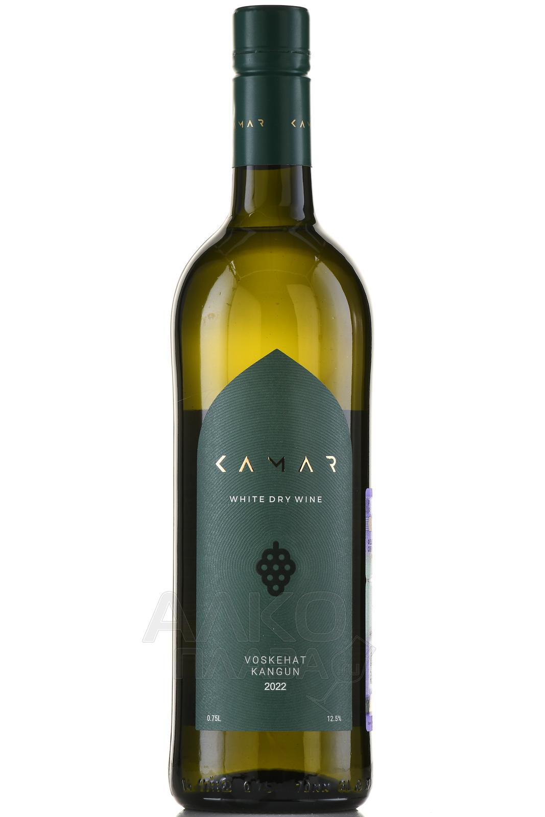 Белое сухое вино Камар Воскеат Кангун 2022 год 0,75 л производится в Армении. Виноград автохтонных сортов выращивают в регионах Армавир и Вайоц Дзор, которые известны своими виноградниками и благоприятным климатом для лозы. Процесс винификации включает мягкое прессование ягод, ферментацию в стальных чанах при контролируемой температуре и выдержку в тех же емкостях. Это вино отличается насыщенным ароматом с оттенками тропических фруктов и сбалансированным профилем. Оно получило положительные отзывы за свое качество и вкус.