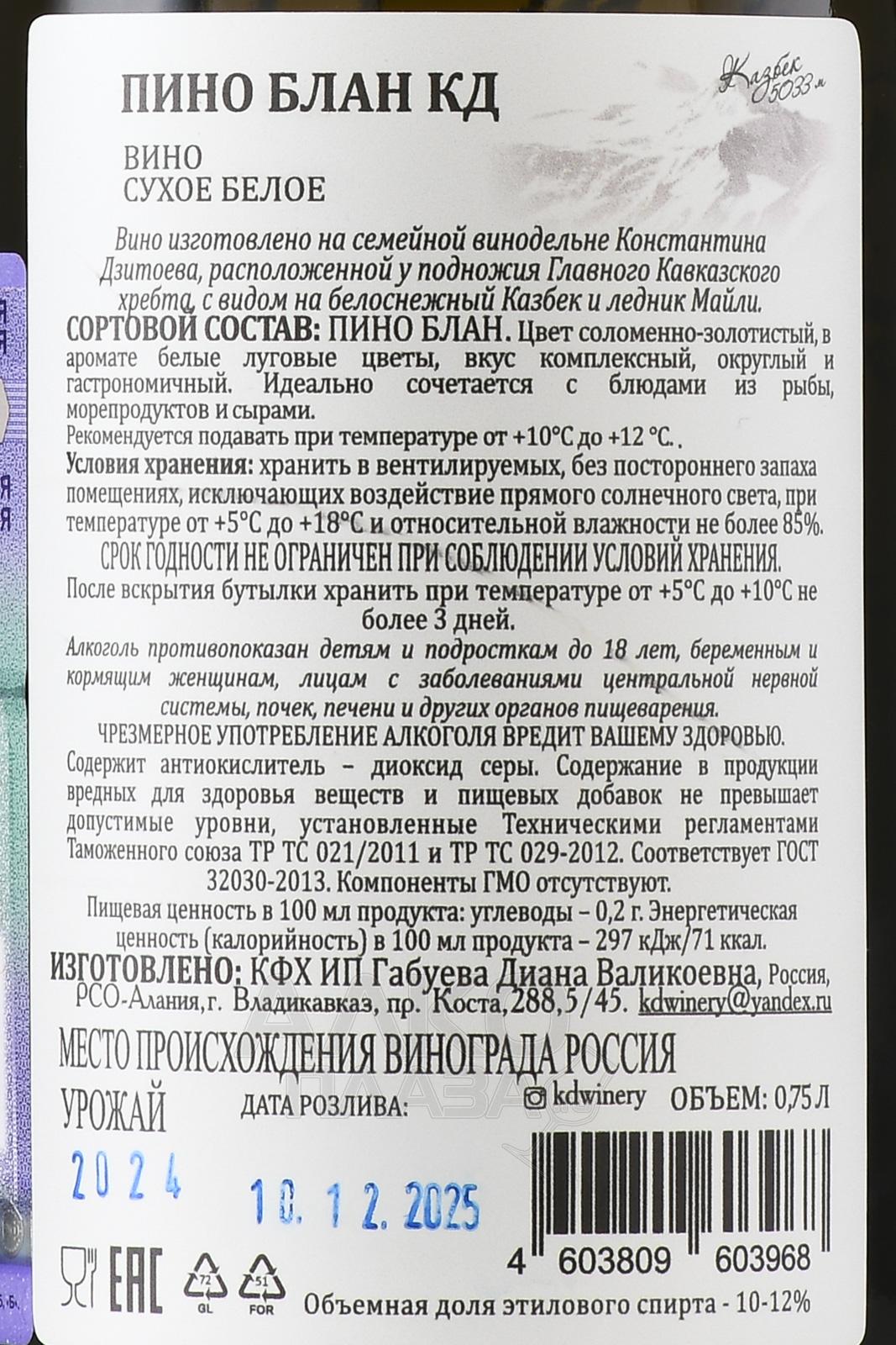 Белое сухое вино КД Пино Блан Резерв 0,75 л изготовлено в России на семейной винодельне Константина Дзитоева у подножия Главного Кавказского хребта, с видом на ледник Майли и величественный Казбек. В основе используется виноград, выращенный в горной зоне с выраженной суточной амплитудой температур, что способствует сохранению кислотности и ароматической чистоты ягод. Производственный цикл включает ручной сбор, бережное прессование и ферментацию при контролируемых значениях. Категория Резерв предполагает дополнительное созревание напитка. Разливается вино в бутылки, расписанные вручную художницами предприятия.