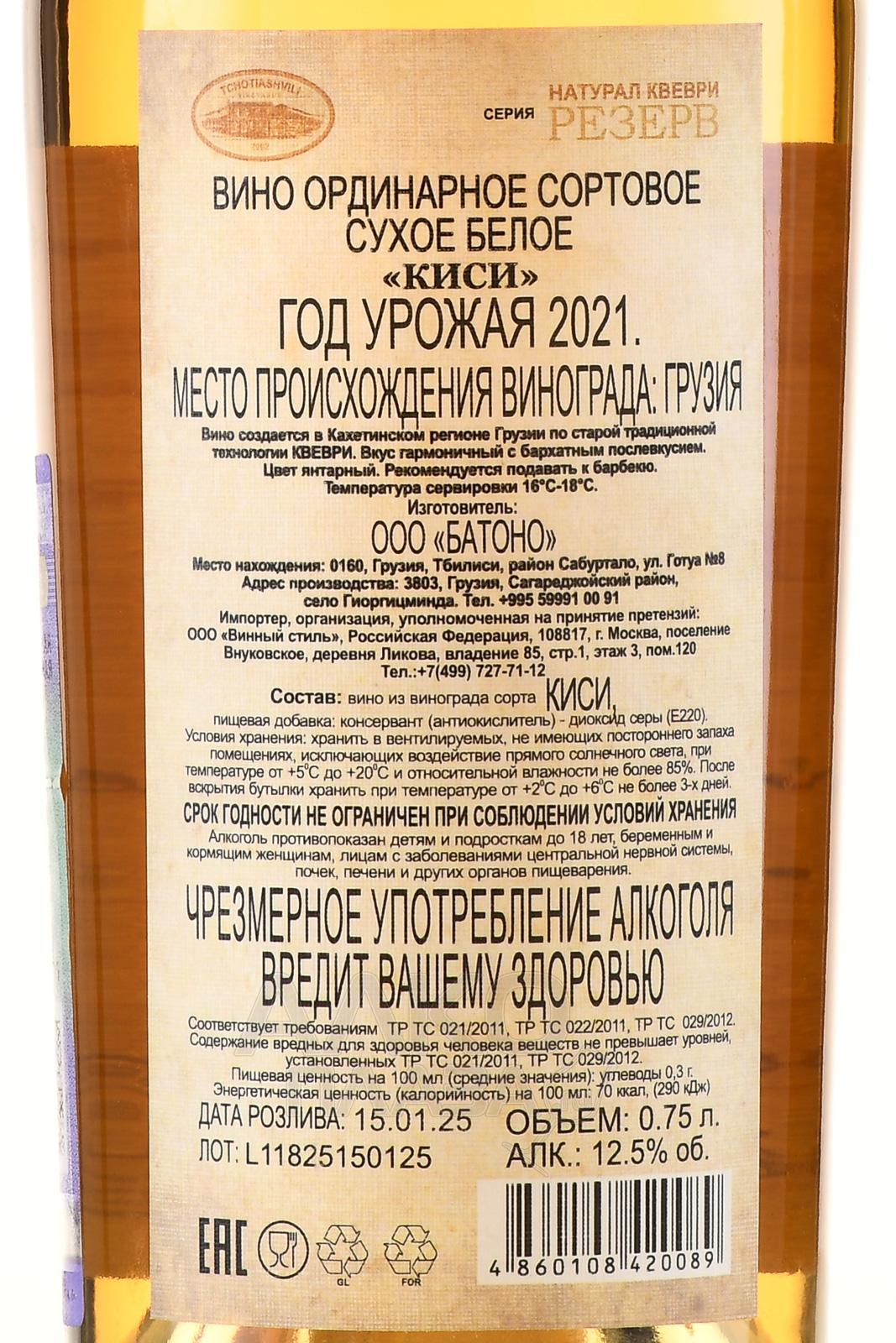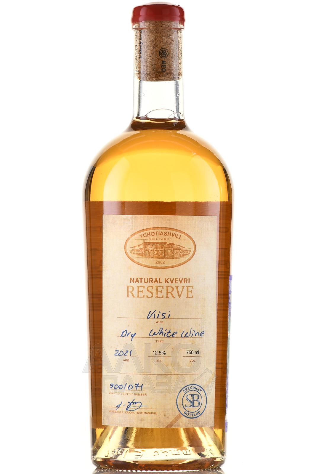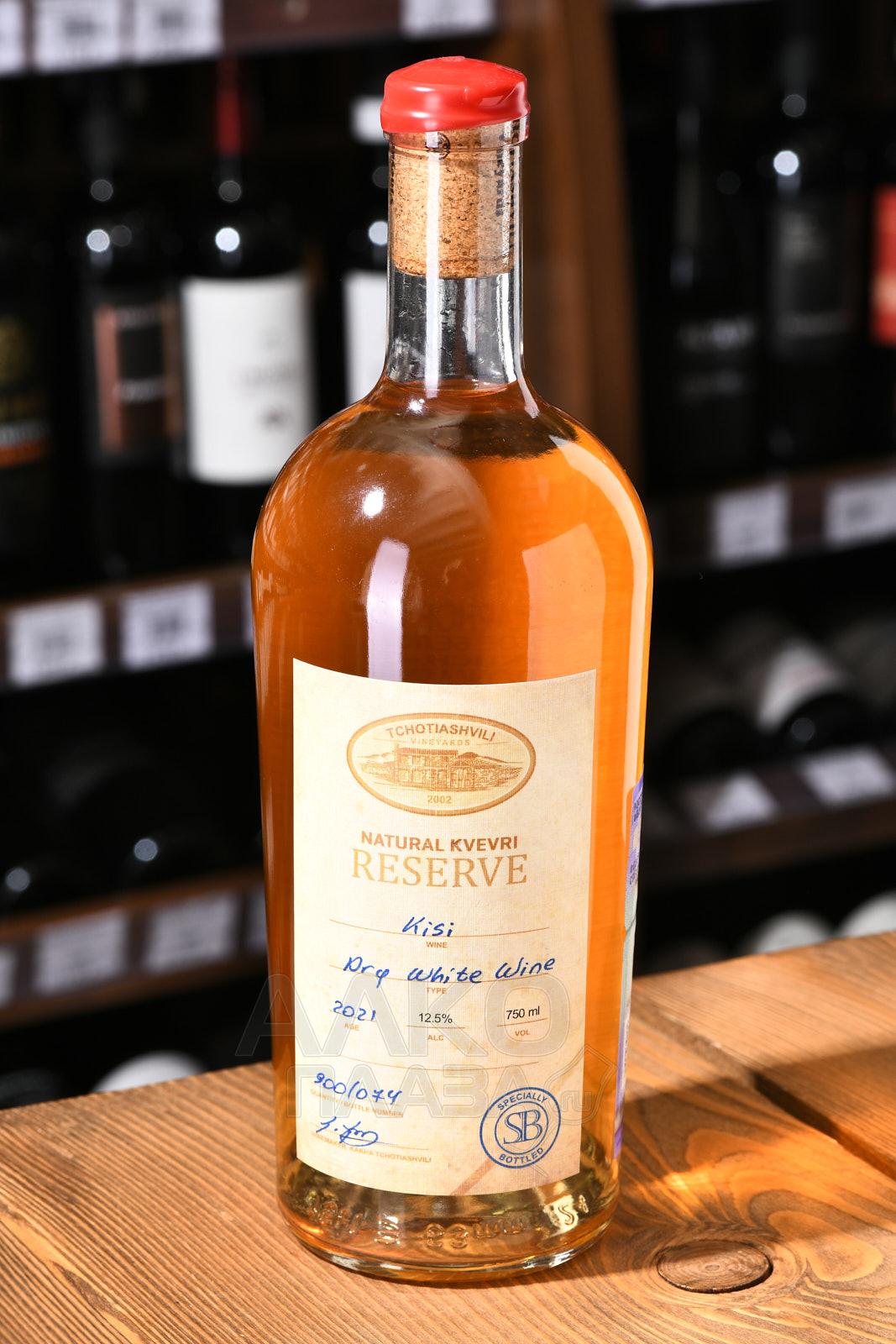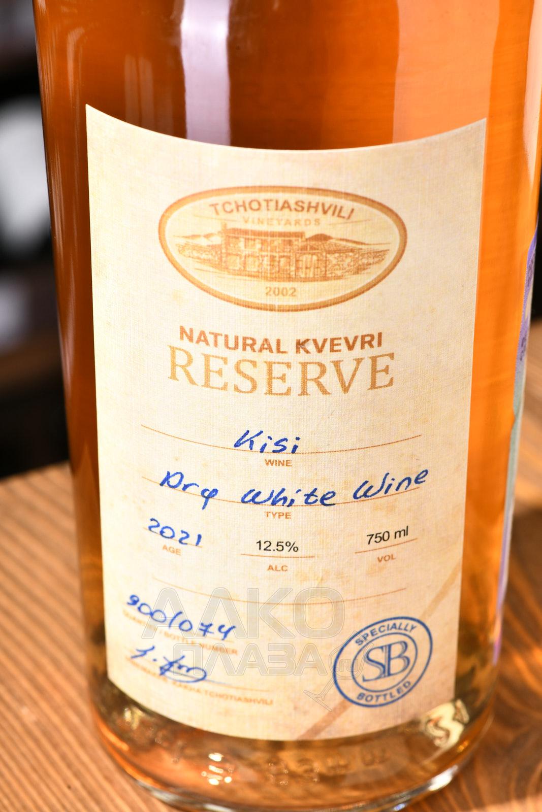 Вино белое сухое Kisi Natural Kvevri Reserve Tchotiashvili 2020 г. 0,75 л создано древним грузинским методом из ягод давно забытого, но сейчас возрождающегося местного сорта. Урожаи, собранные с кахетинских виноградников возрастом более 20 лет, ферментировали способом производства красных вин – вместе с мезгой. Процесс проходил в естественном температурном режиме в огромных глиняных емкостях в форме кувшинов без ручек – квеври. Брожение продолжалось медленно и долго – в течение 7,5 месяцев, после чего спиртное не менее 2 лет созревало на осадке.
