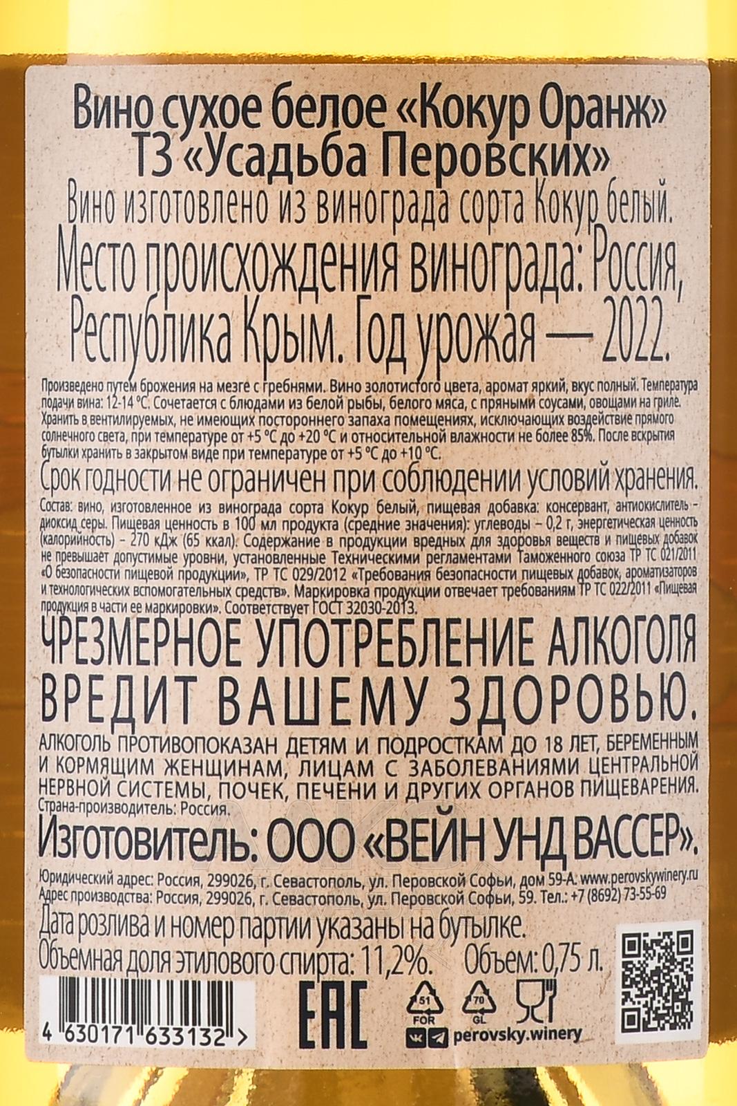 Белое сухое вино Кокур Оранж Усадьба Перовских 0,75 л — это авторский образец крымского виноделия с ярко выраженным стилем skin contact. На производство пошли ягоды автохтонного сорта, собранные в долине реки Бельбек, на юго-западных склонах с высотой до 300 метров над уровнем моря. Почвы здесь каменистые, с преобладанием известняка и глины. Ягоды ферментировались вместе с кожицей в течение 14 дней в нейтральных емкостях, что позволило сохранить природную структуру и усилить ароматику. Выдержка на осадке продолжалась около 6 месяцев, добавив телу плотности и придав легкий пряный нюанс.