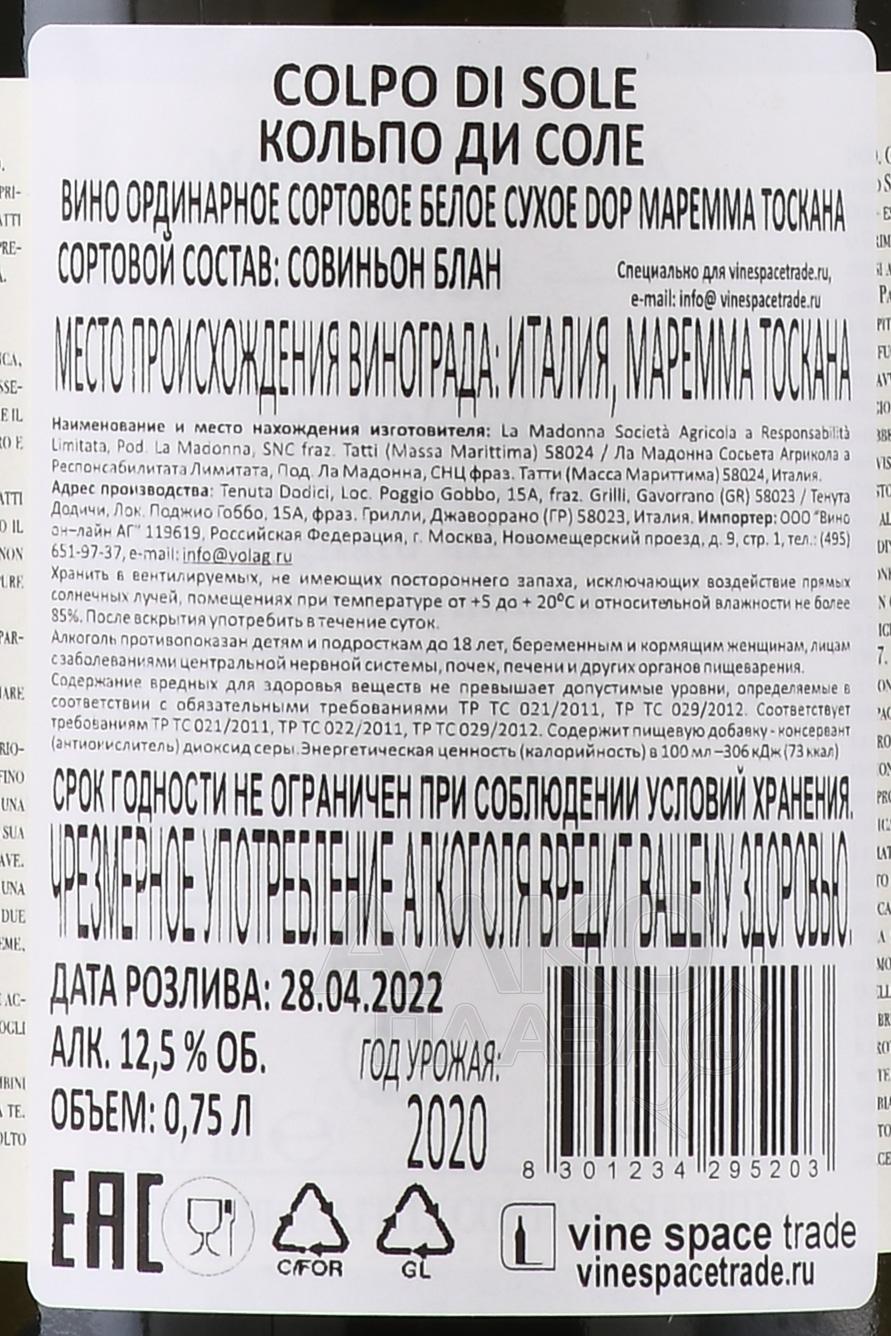 Вино Tenuta Dodici Colpo Di Sole 0,75 л – коллекционный белый сухой напиток с потенциалом хранения 10-15 лет. Благодаря терруару, в котором выращивают урожай Совиньон Блан, и особенностям технологии винификации, спиртное приобретает нетипичный насыщенно-пряный вкусоаромат. Лучше всего органолептику вина передает его название, которое в переводе с итальянского означает «солнечный удар». Ягоды подвергают холодной мацерации при 5 °С на протяжении 12-24 часов, а затем сусло оставляют ферментироваться в стальных емкостях. После алкогольного брожения следует малолактическая ферментация и 8-месячная выдержка в бочках из акации. Перед продажей вино проводит 90 дней в бутылках в винном погребе.