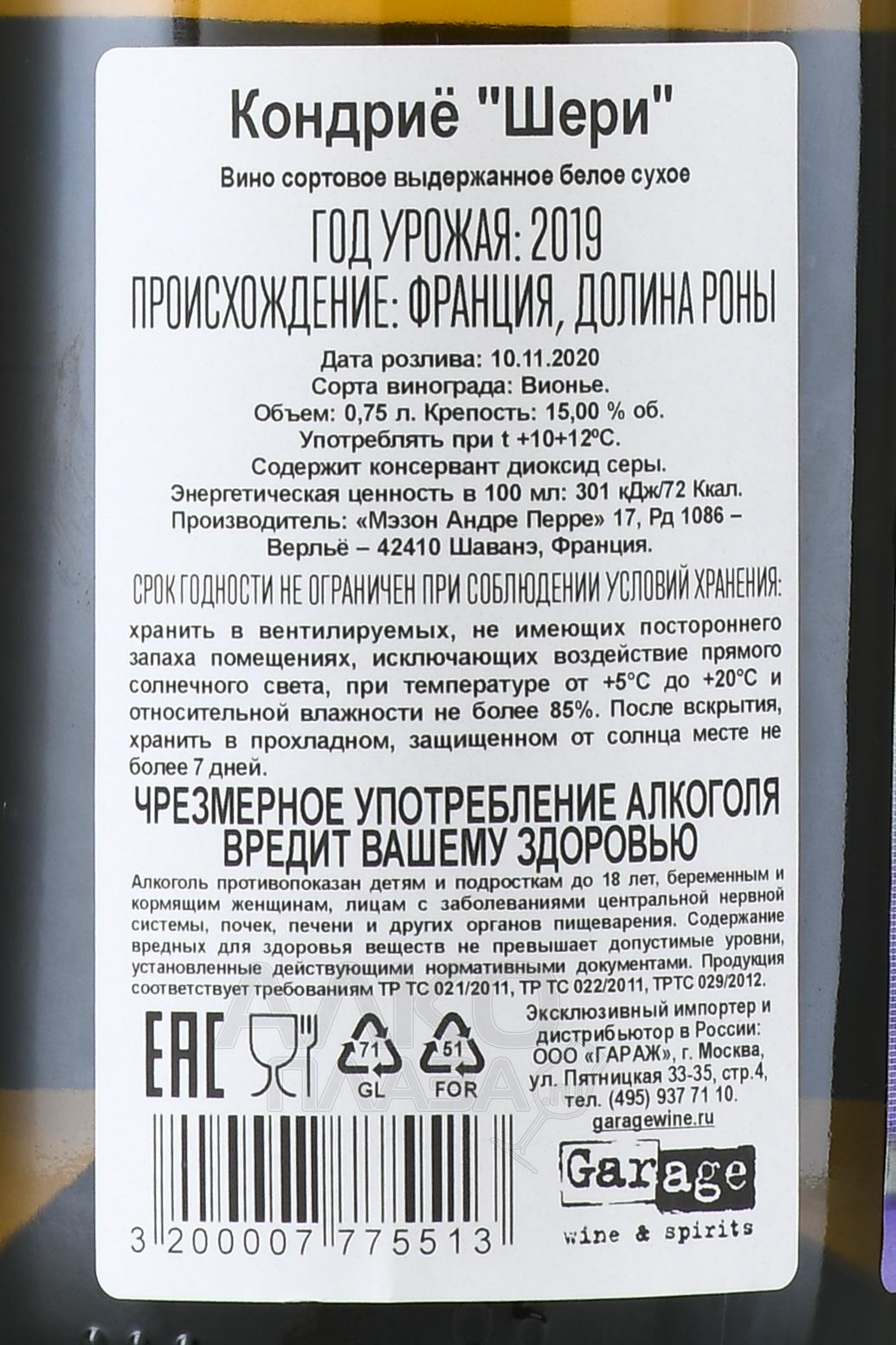 Белое сухое вино Andre Perret Condrieu 0.75 л — изысканный сорт из винограда Вионье, который производится в апелласьоне Кондрие. Здесь лозы растут на почвах из смеси песка, гранита, кварца и слюды. Сбор урожая осуществляется вручную с 20-летних лоз. Ягоды отделяют от веточек и прессуют. Одну половину сусла сбраживают в стальных чанах, вторую — в дубовых бочках, из которых 20% новые, а 80% используются уже 1-4 года. Вино выдерживается в тех же емкостях 12 месяцев, в перед бутилированием обе партии смешиваются. Срок хранения в бутылках составляет 2-5 лет.