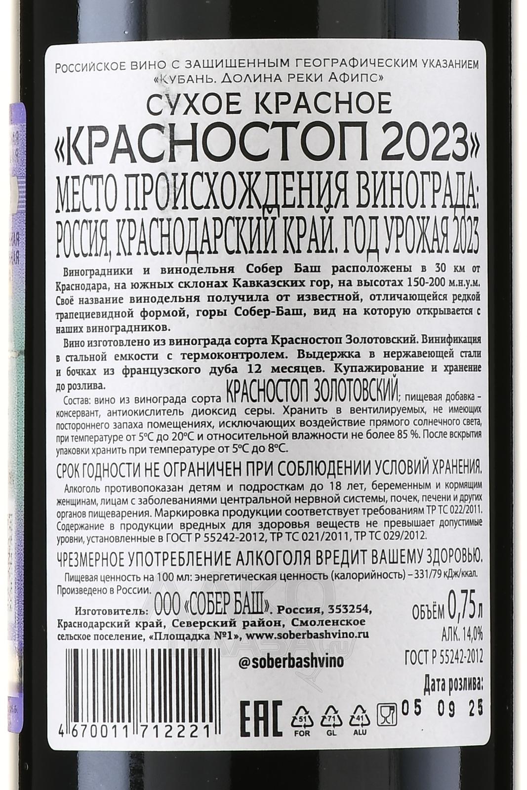Красное сухое вино Красностоп Собер Баш 0,75 л изготовлено на юге России, в пределах Краснодарского края, из отечественного сорта винограда с угодий высотой порядка 200 м над уровнем моря. 14-градусный алкоголь классической категории произведен с применением технологии ферментации в стальной терморегулируемой таре. Для получения бархатистого сложного вкуса вино год вызревало во французском дубе.