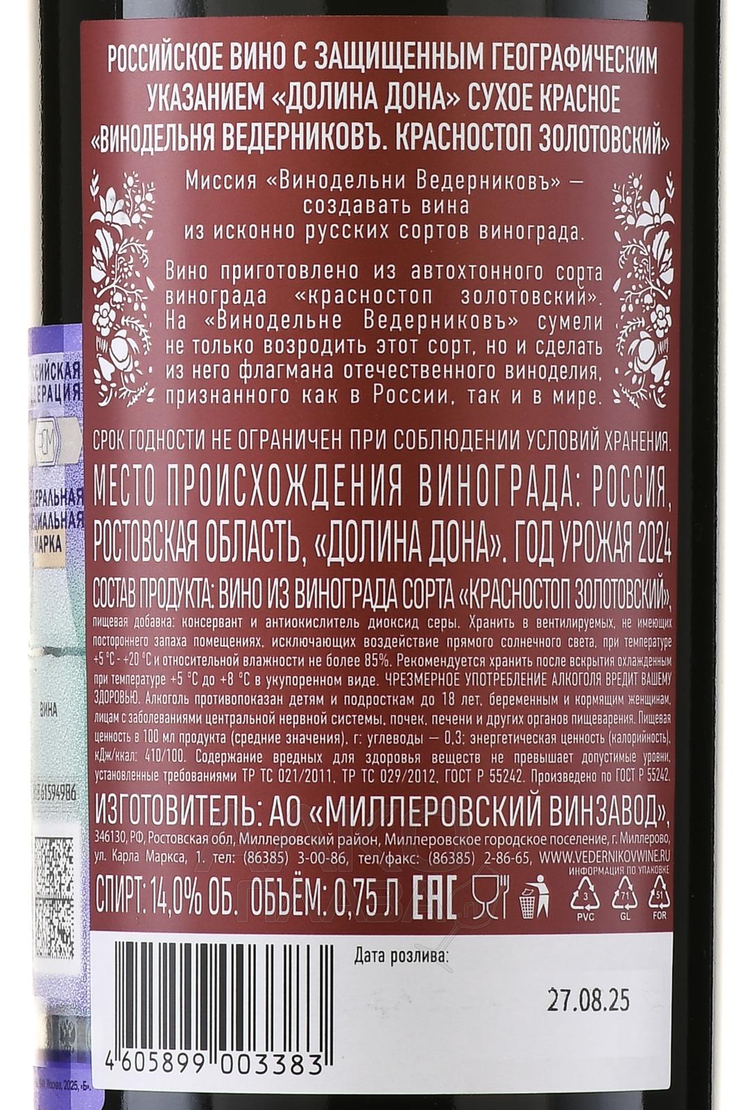 Красное сухое вино Ведерниковъ Красностоп Золотой — витнтажный алкоголь в ассортименте российской компании, предлагаемый при уровне содержания алкоголя 14,5%. Его изготовление прошло в Ростовской обл., сырьём стал местный виноград аборигенного сорта с соблюдением норм урожайности. Тщательно выявленные ягоды были отделены от гребня, прошли ферментацию, а затем их поместили в бочонки из французской дубовой древесины для 16-месячного вызревания. Эксперты советуют декантировать это вино до дегустации.