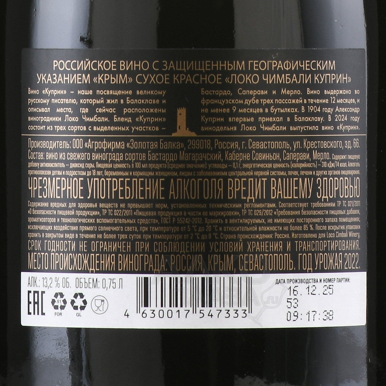 Красное сухое вино Локо Чимбали Куприн 0.75 л — авторский купаж от винодельни Loco Cimbali, расположенной в Балаклавской долине Крыма. В его состав входят сорта винограда Бастардо Магарачский, Мерло и Саперави. Урожай собирают вручную, ягоды проходят двойную сортировку и холодную мацерацию. Ферментация длится 14 дней в емкостях из нержавеющей стали при температуре 20–22 °C. Затем вино выдерживают 12 месяцев в бочках из французского дуба объёмом от 225 до 300 литров и дополнительно 9 месяцев в бутылках. Уникальность напитка — сочетание редких местных и международных сортов, а также выдержка в бочках разного уровня обжига, что придает особую глубину вкуса и аромата.
