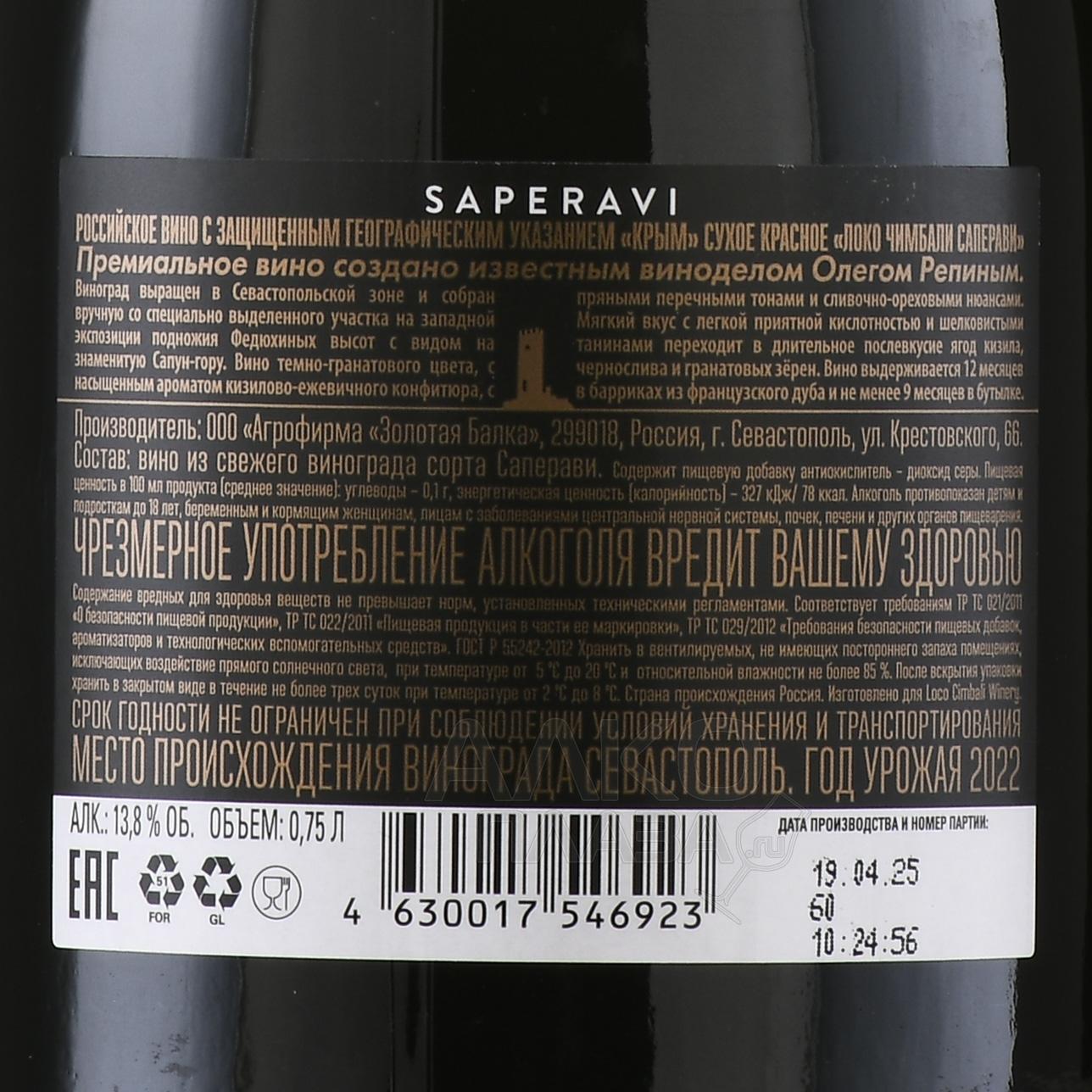 Красное сухое вино Локо Чимбали Саперави Резерв 0,75 л — это выдержанный вариант родом из Балаклавской долины, где виноградники размещены на склонах с перепадами высот от 150 до 300 метров над уровнем моря. Почвы там — богатые карбонатами слои, глина с примесью марганца и немного известняка. Ветра с моря создают сквозняки, жаркое лето сопровождается небольшим количеством осадков — лишь около 300 мм за вегетацию — и температурой выше среднего (до 32 °C в пиковые дни). Это стимулирует постепенное созревание кожицы плодов и концентрацию фенолов. Ягоды собирают вручную в ящики по 12 кг, затем посредством строгой сортировки отбирают только здоровые грозди. Ферментация проходит с определённой долей шкурок при контролируемой температуре в стальных чанах, после чего идёт выдержка в течение 10–14 месяцев во французских барриках объёмом 225 л, а затем минимум 6 месяцев напиток проводит в бутылке.