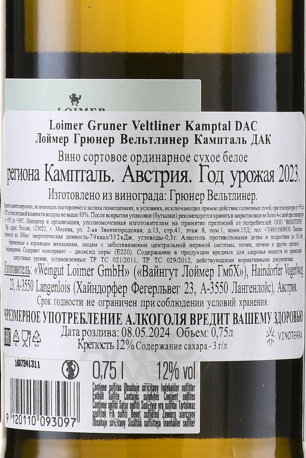 Лоймер Грюнер Вельтлинер Кампталь-Loimer, Langenlois Gruner Veltliner — сочное вино с тонким балансом и прекрасными пряно-фруктовыми оттенками во вкусе и аромате. Виноград для изготовления вина выращивается в Лангелойс (регион Кампталь), где горячий континентальный климат встречается с холодным, текущим из Вальдфиртеля. Почвы виноградников, сертифицированных как органические, являются уникальными по составу и идеально подходят для виноградарства. Урожай собирается вручную в 20-килограммовые ящики с середины по конец октября. Вино обладает сухим, сочным, пряным, хорошо сбалансированным, свежим вкусом с фруктовыми оттенками и гармоничной кислотностью.