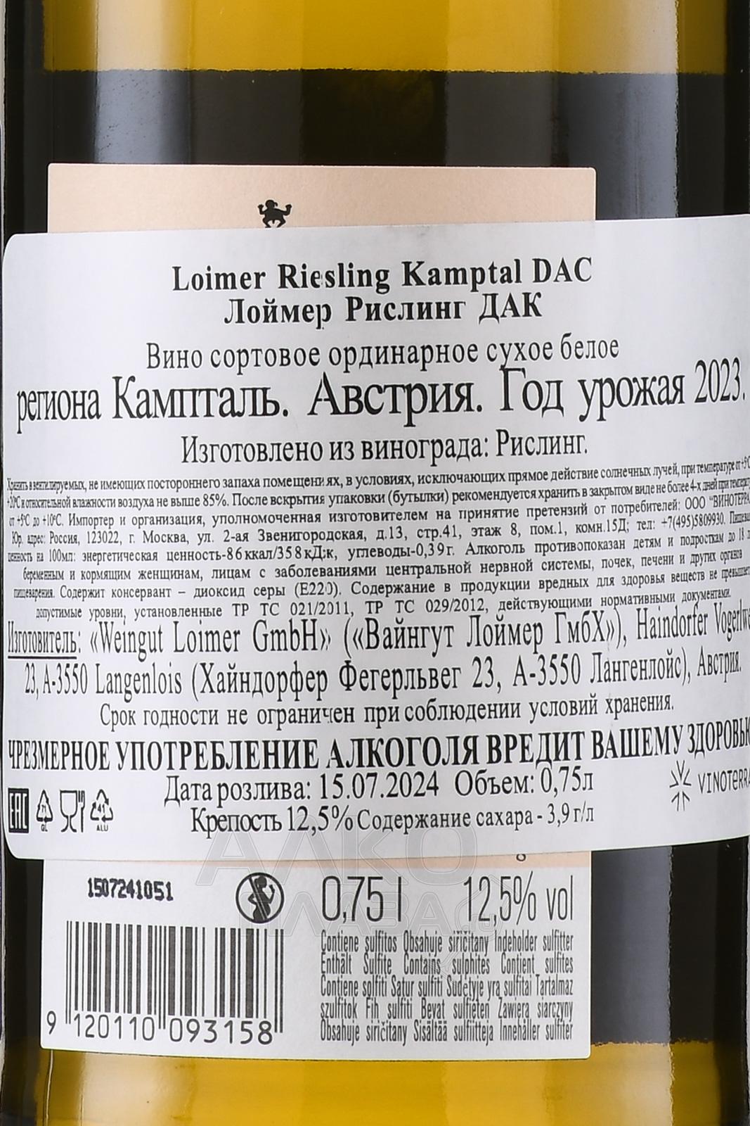 Австрийское вино Лоймер Рислинг - Loimer, Riesling — изысканное сухое вино, созданное из выращенного в Нижней Австрии (Кампталь) винограда сорта Рислинг. Популярный в этой местности сорт выращивают на участках, расположенных на высоте 380 м над уровнем моря. Здесь континентальный жаркий климат охлаждается ветрами, а почвы богаты гравийными породами, известняком и глиной. Вкус вина — свежий, интенсивный, с гармоничной кислотностью, яркими акцентами лайма и других цитрусовых, едва уловимыми намеками соли и изящными штрихами жимолости в устойчивом, красивом послевкусии.