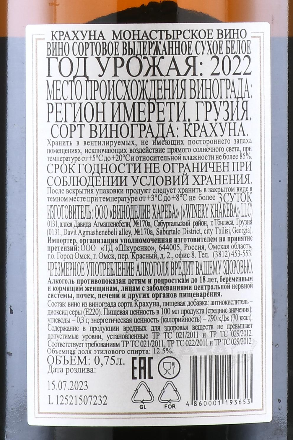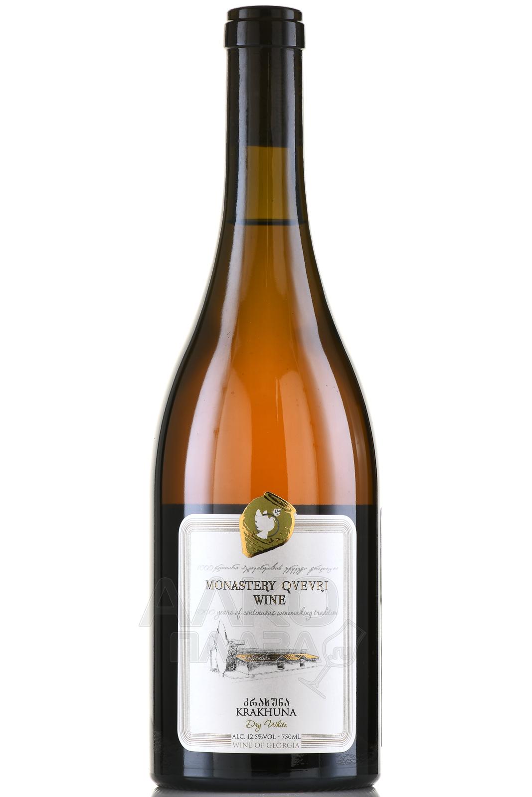 Белое сухое вино Монастырское Квеври Крахуна 0,75 л создано в грузинской традиции методом «квеври», при котором ферментация и выдержка протекают в больших глиняных амфорах, закопанных в землю. Виноград редкого автохтонного сорта Крахуна растет в терруаре с известняковыми и глинистыми почвами в умеренном климате, который обеспечивает сбалансированную кислотность и солнечную зрелость. Ферментация проходит с естественными дрожжами в квеври, затем вино выдерживают до шести месяцев на осадке, что придает ему мягкую текстуру и глубину вкуса. Уникальность напитка заключается в сочетание древнего способа производства и современных стандартов качества. Среди достижений – высокие оценки на профильных дегустациях и положительные отзывы от международных критиков, а также попадание в топ-списки грузинской классики.