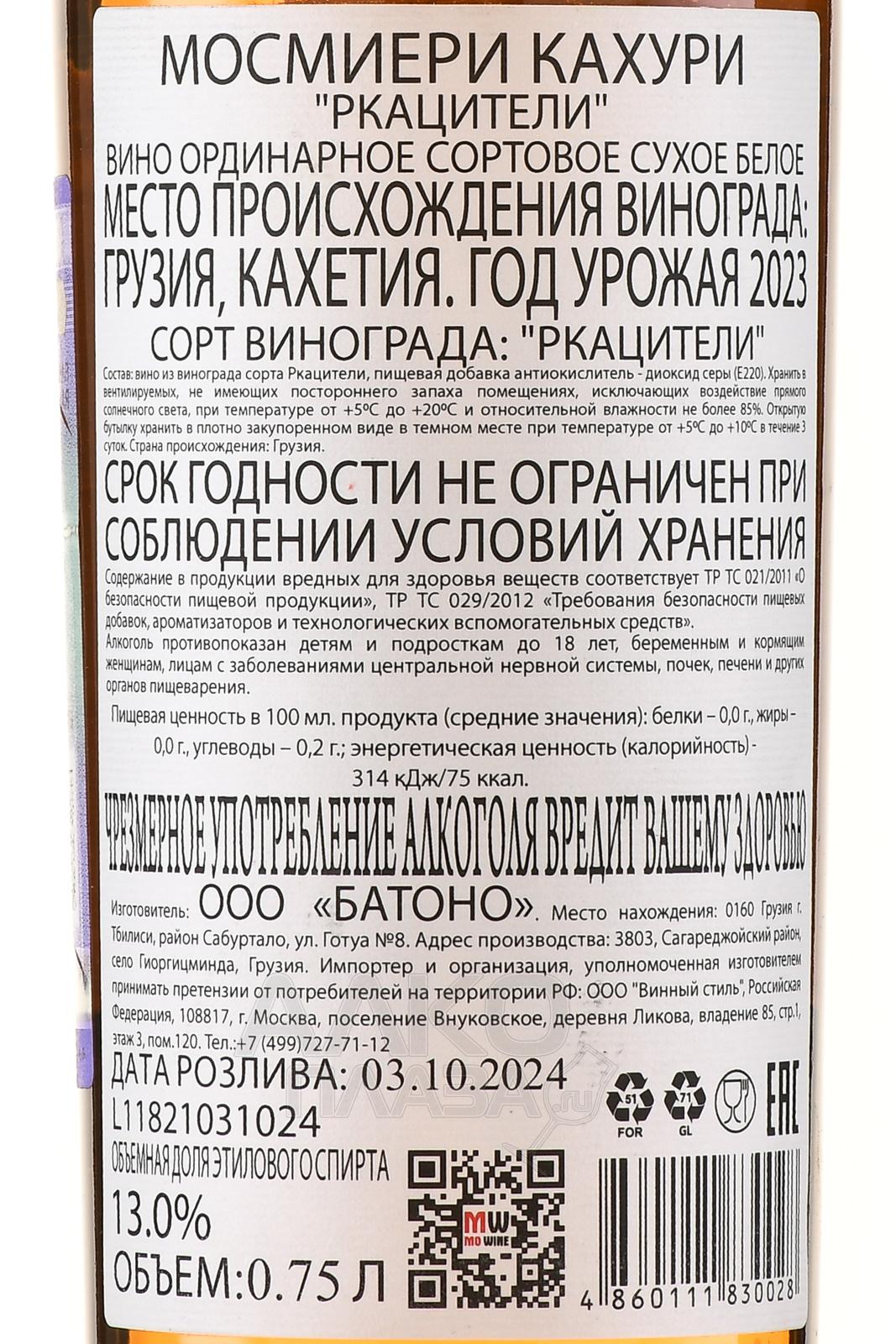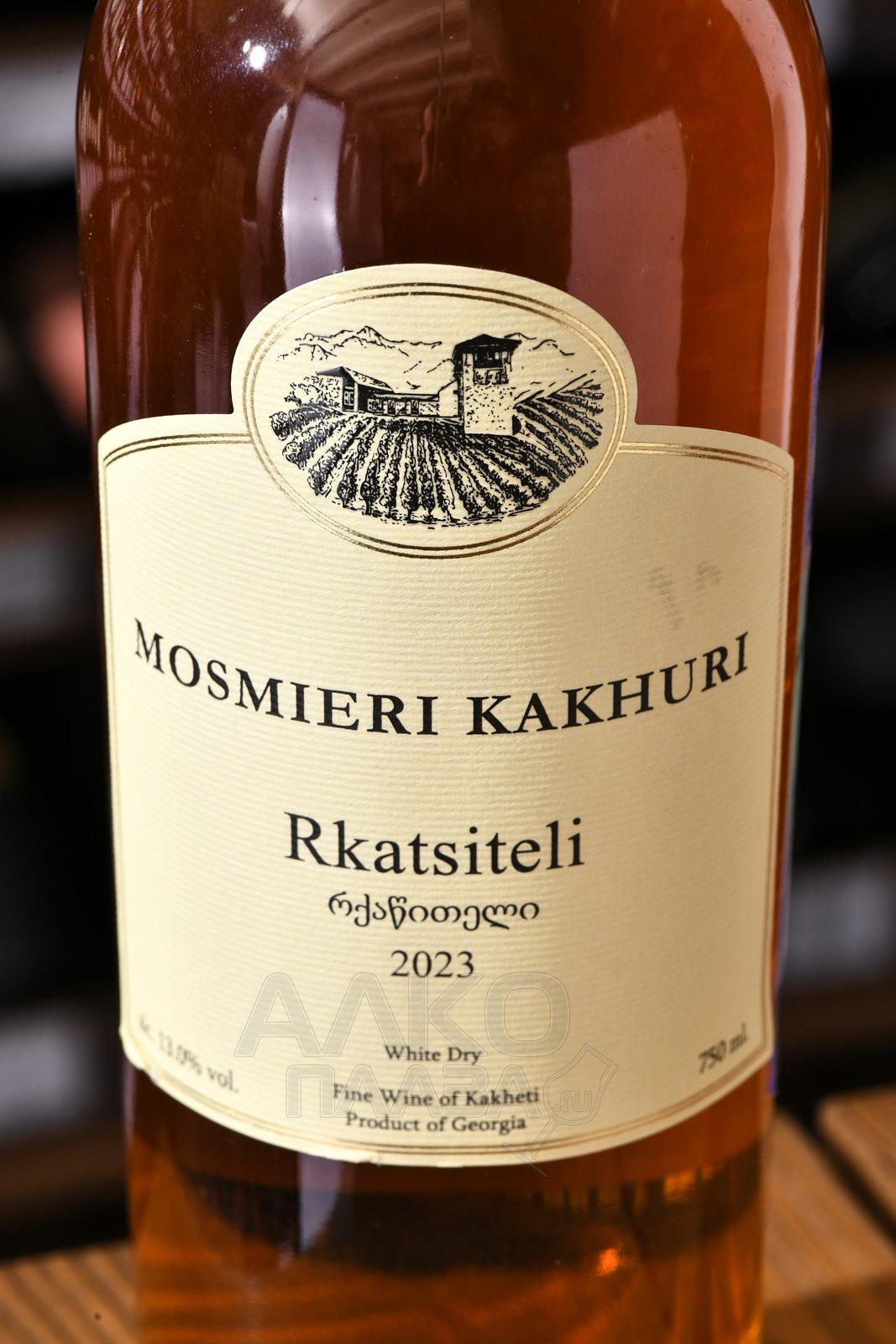 Белое сухое вино Мосмиери Кахури Ркацители 0,75 л создают в Кахетии, где хозяйство Mosmieri разрабатывает собственную интерпретацию местной технологии. Виноград растёт на склонах Телавского района на высоте около 500–600 м. Почвы представлены аллювиальными и глинисто-известковыми слоями, которые дают ягодам стабильную кислотность. Контраст между жаркими днями и прохладными ночами позволяет накапливать ароматические соединения без потери структуры. Урожай собирают вручную с сортировкой гроздей. В производстве используют традиционный метод: брожение и выдержка проходят на мезге и кожице в квеври, закопанных в землю. Такой способ формирует плотный профиль, подчёркивает природные особенности сорта и усиливает глубину напитка.