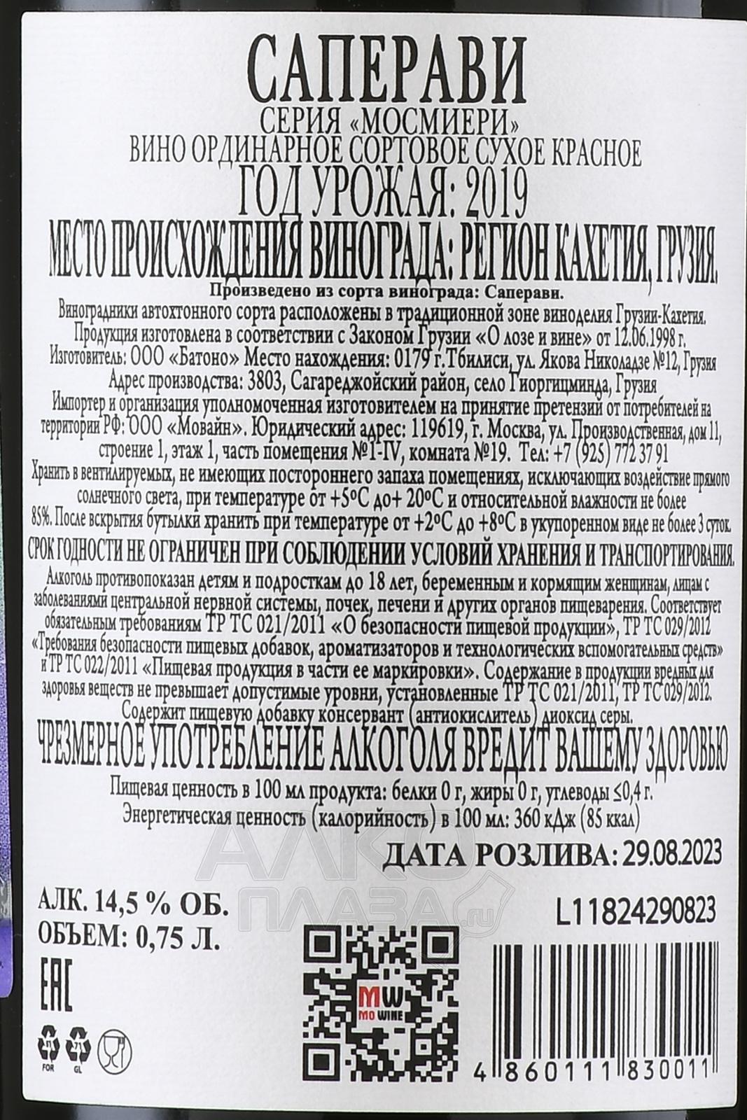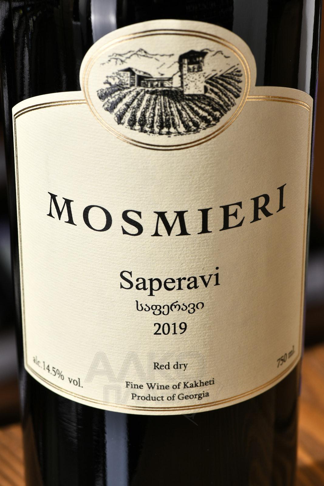 Красное сухое вино Мосмиери Саперави 0,75 л создано в Кавказских горах, где виноград созревает на каменистых почвах Кахетии. Местный терруар формируется за счет тёплого лета, резких суточных перепадов температуры и высоты более 500 м над уровнем моря. Ягоды получают концентрированный сок и плотную кожицу, что повышает природную насыщенность будущего напитка. Производитель использует традиционную ферментацию с длительным скин-контактом в огромных глиняных чанах-квеври в виде кувшинов, вкопанных в землю до горловины. В этих ёмкостях естественным образом поддерживается оптимальная температура брожения, в процессе которого сусло наполняется богатой гаммой вкусовых и ароматических нюансов. В древнегрузинском языке слово «Мосмиери» означает человека, который умеет пить вино и ценить его по достоинству. Это слово передаёт идею хозяйства, стремящегося создавать напитки, которые сохраняют связь с многовековой грузинской традицией виноделия.