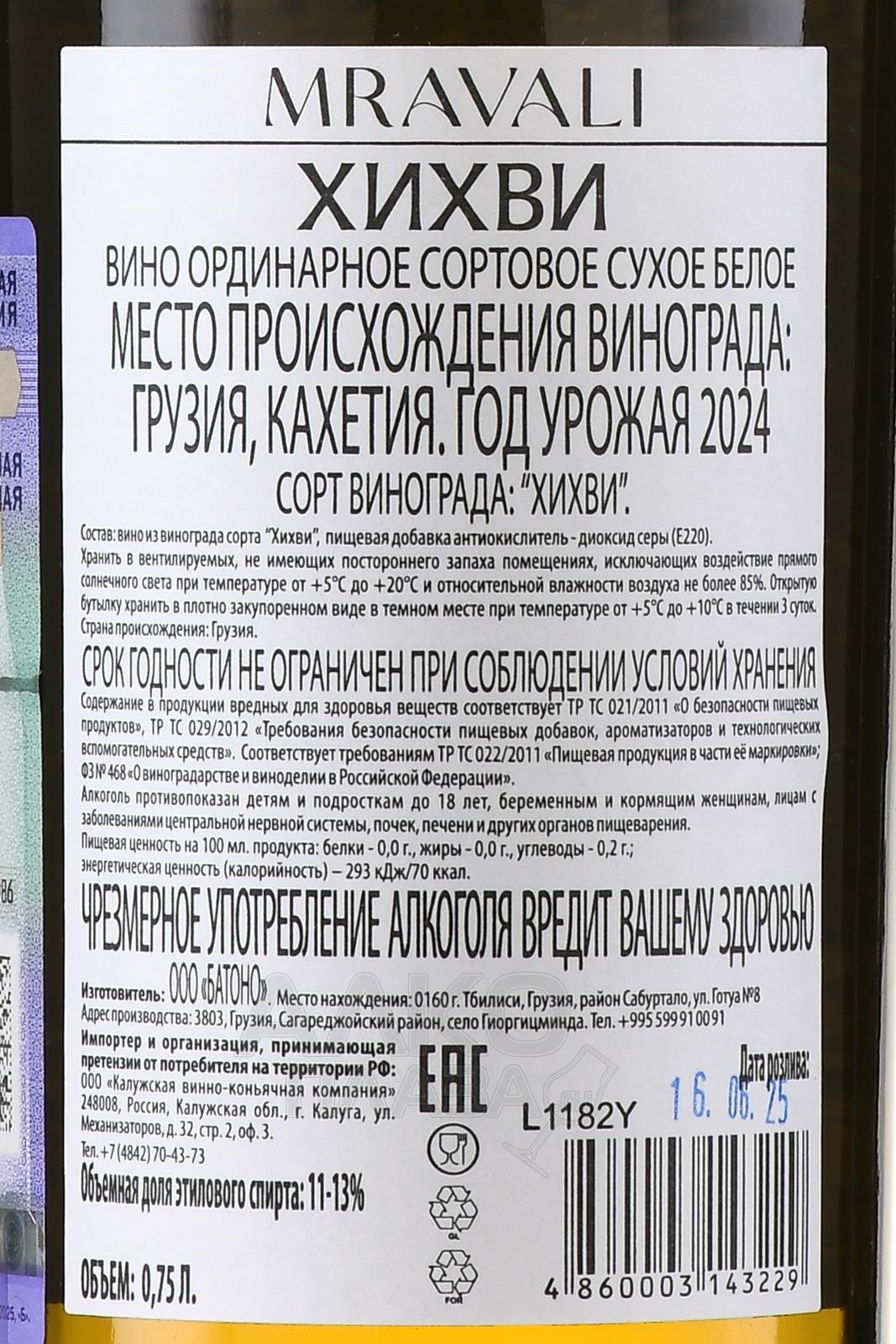 Белое сухое вино Мравали Хихви 0,75 л создают в Кахетии, где ягоды белого автохтона, ставшего основой для напитка, выращиваются на участках с аллювиально-глинистыми почвами и каменистыми вкраплениями. Виноград растёт на высотах около 350–500 метров над уровнем моря, в климате с жаркими солнечными днями и прохладными ночами. Урожай собирают вручную в период, когда сахар в плодах достигает 20–22%, а кислотность сохраняется на умеренном уровне. Ферментация проходит в стальных ёмкостях при контролируемой температуре 14–16 °C, что помогает сохранить ароматическую структуру и природную свежесть. Далее вино отдыхает также в стали и бутилируется.