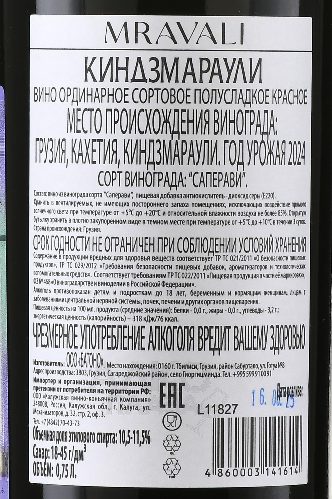 Красное полусладкое вино Мравали Киндзмараули 0,75 л производится в Кахетии, в микрозоне, расположенной на южных склонах долины реки Алазани. Терруар здесь уникален: аллювиальные и песчано-гравийные почвы с высоким содержанием минералов, высоты от 250 до 550 метров над уровнем моря, большое количество солнечных часов и резкие суточные колебания температур. Эти условия помогают ягодам накапливать сахар естественным образом, поэтому напиток достигает природной сладости без добавления концентратов. Урожай обычно собирают вручную в конце сентября, когда ягоды достигают 22–24% сахара. Винификацию проводят методом терморегулируемой ферментации с последующей остановкой брожения, чтобы сохранить природный баланс мягкой сладости и виноградной свежести.