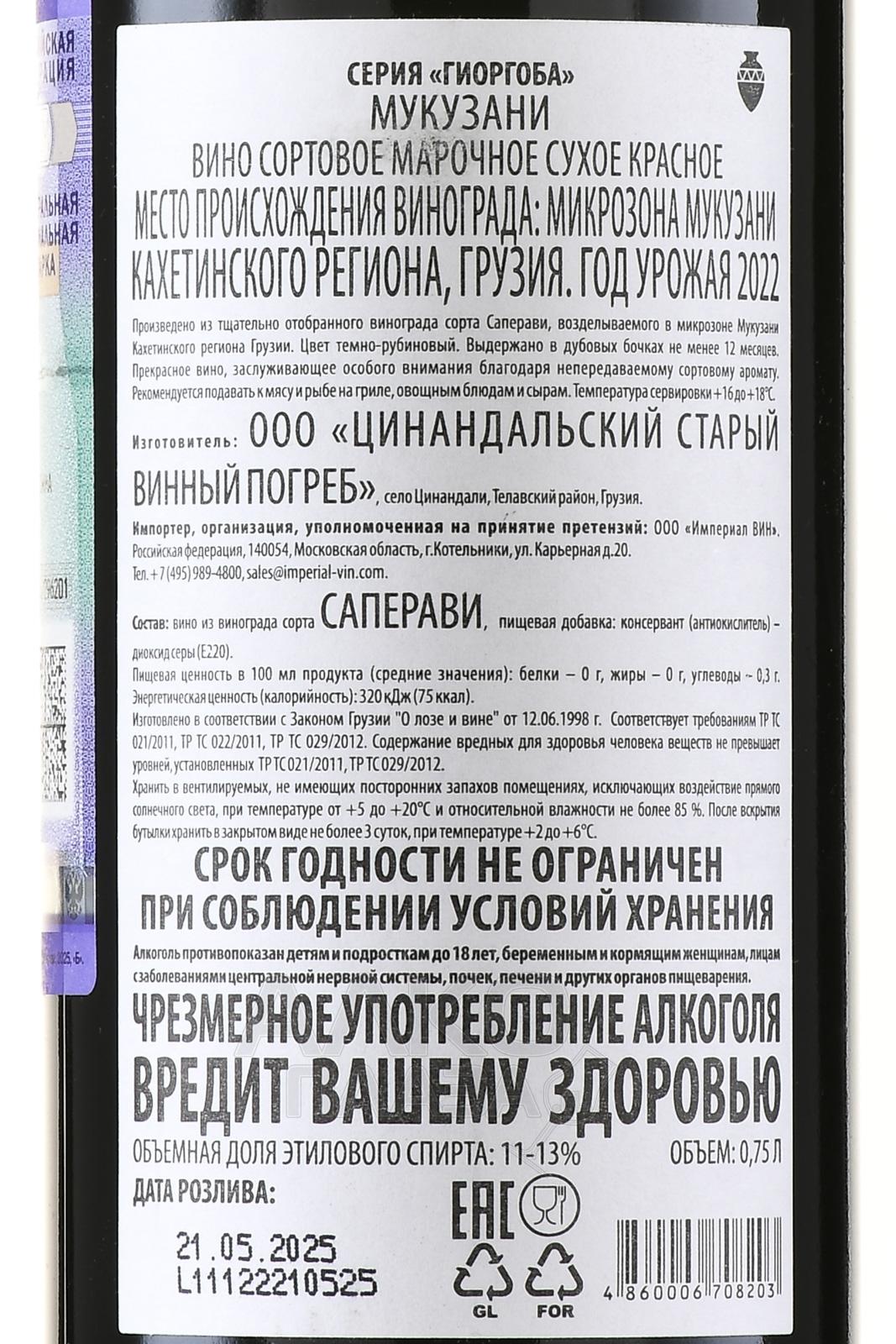 Красное сухое вино Мукузани серия Гиоргоба 0,75 л — известная вариация виноградного спиртного Грузии, которая является марочной и контролируется по области происхождения: микрозоне Мукузани в Кахетии. Сбор урожая на участках компании «Цинандальский старый винный погреб» происходил после полного созревания ягод. При осуществлении сбраживания в чанах постоянно поддерживали строгий температурный режим. До бутилирования это высококачественного популярное вино один год выдерживалось в барриках на базе древесины дуба.