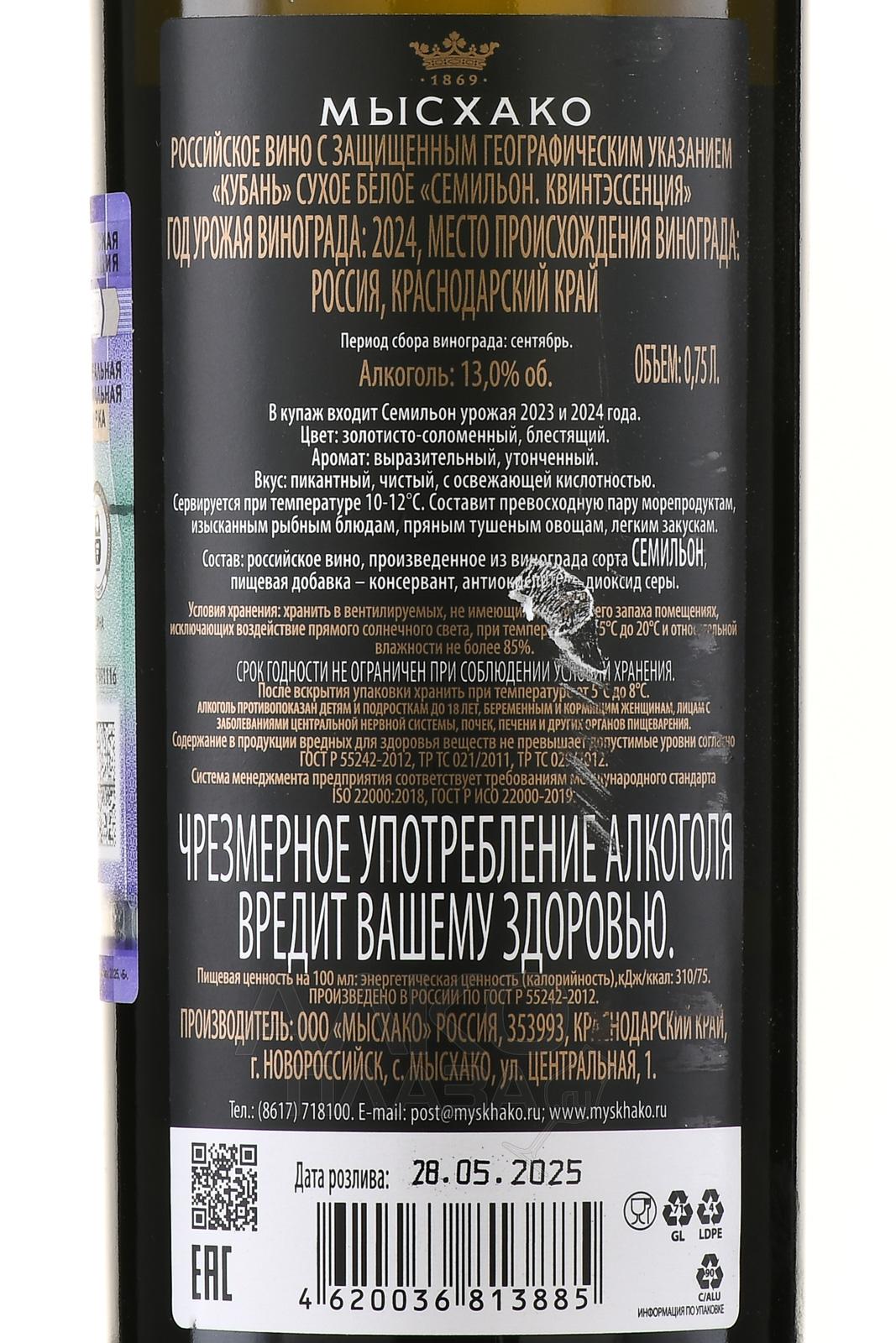 Белое сухое вино Мысхако Квинтэссенция Семильон 0,75 л — изысканное, гармоничное, создано из винограда с кубанского виноградника под Новороссийском. Терруар с мягким климатом и морским влиянием обеспечивает баланс кислотности и зрелости ягод. Вино представляет собой купаж двух урожаев: Семильона 2023 года, выдержанного в бочках из американского дуба второго использования, и Семильона 2024 года, прошедшего ферментацию на тиоловых дрожжах и выдержку в нержавеющих емкостях. Такое сочетание придает напитку сложную структуру, где дубовая мягкость сочетается с яркой свежестью. Вино отличается чистотой вкуса и минеральностью, что делает его примером современного российского виноделия. Мысхако Квинтэссенция Семильон отмечено вниманием критиков и ценителей за утонченность и сбалансированный стиль.
