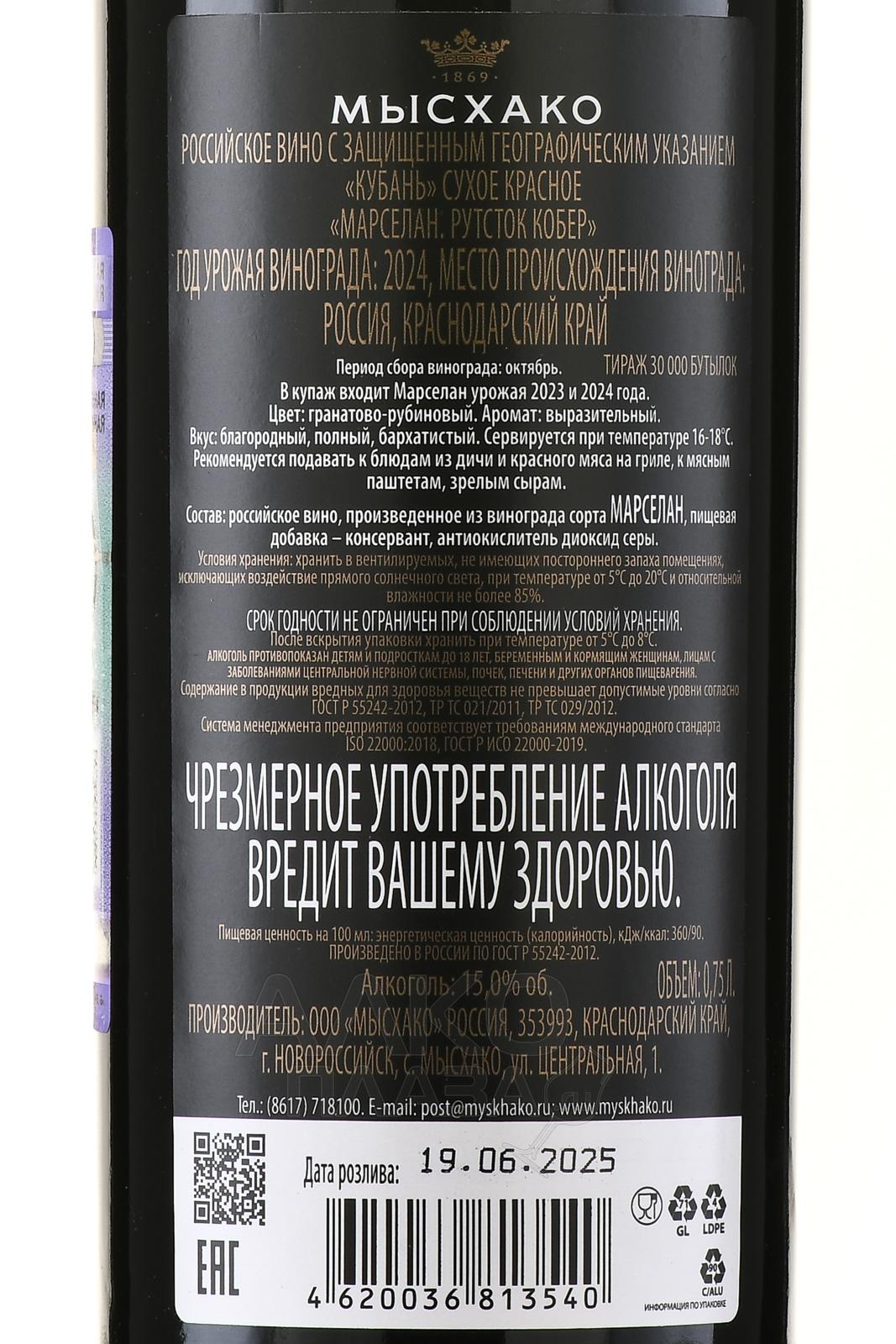 Красное сухое вино Мысхако Рутсток Кобер Марселан 0,75 л — это пример научного подхода к виноделию и уважения к терруару Черноморского побережья. Редкий для Краснодарского края сорт Марселан был выращен на склонах у села Мысхако, в особом терруаре, где мягкий морской климат и известковые почвы создают идеальные условия для созревания винограда. Лозы привиты на подвой Kober, который формирует мощную корневую систему и помогает раскрыть глубину вкуса. Урожай собирается вручную в октябре. Для 40% сусла используется технология самотека (ягоды давятся под собственным весом, сок вытекает медленно), что усиливает ароматический профиль. 60% вина выдерживали больше года в бочках из американского дуба, что придало вкусу благородные ноты ванили и специй. Вино получило золото «Продэкспо-2025». Оно будет храниться и развиваться в бутылке на протяжении 10 лет.