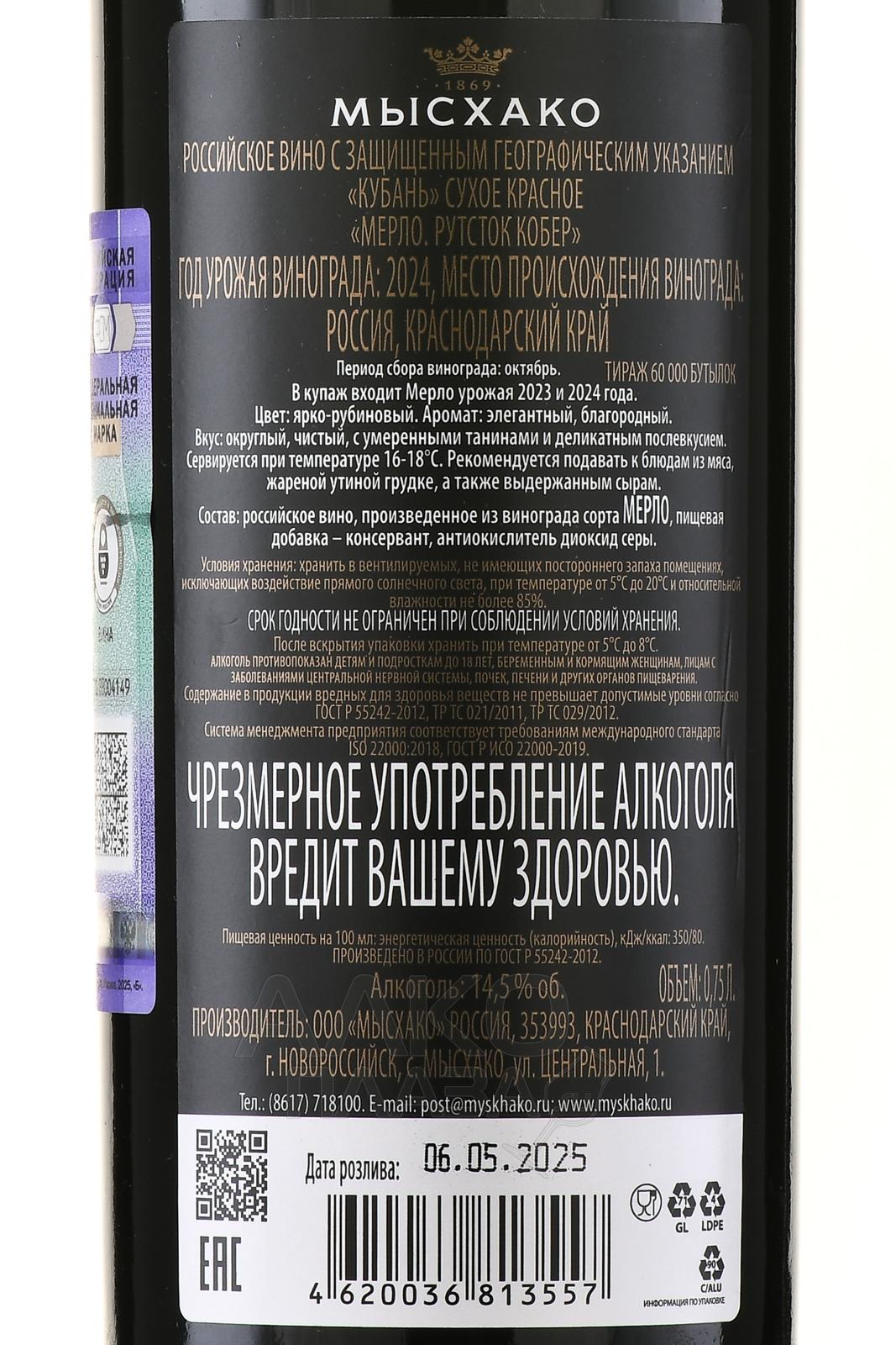 Красное сухое вино Мысхако Рутсток Кобер Мерло 0,75 л — современное, с ярким характером и выразительной структурой. Оно создано из винограда, выращенного в окрестностях Новороссийска, где мягкий морской климат и известняковые почвы способствуют гармоничному созреванию ягод. Производитель уделяет особое внимание научному подходу к виноградарству: лозы привиты на подвой Kober, который отличается мощной корневой системой и позволяет максимально раскрыть особенности терруара. Вино изготовлено из урожаев 2023 и 2024 годов, часть сусла получили самотеком (ягоды давились под собственным весом) для усиления ароматики. Около 60% вина выдерживали в американском дубе 12–14 месяцев, что придало ему бархатистость и легкие тона ванили. Потенциал выдержки — до 10 лет. Мысхако Рутсток Кобер Мерло отмечено золотой медалью конкурса «Винный гид Продэкспо-2025».
