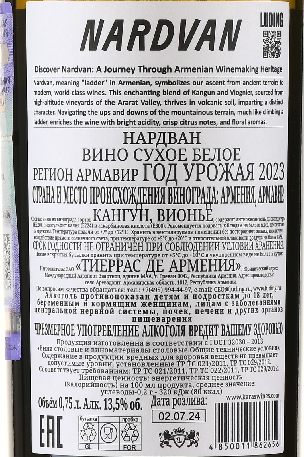 Белое сухое вино Нардван 0,75 л создано из купажа двух сортов — автохтонного и международного. Ягоды вырастили в солнечной Араратской долине. Это одно из старейших винодельческих мест Армении, где виноградники расположены на высоте 850–900 метров над уровнем моря. Почвы здесь вулканические с примесью гальки, а климат резко континентальный — жаркое солнце днем и прохладные ночи способствуют медленному и равномерному созреванию ягод. Напиток сделали методом холодной ферментации в стальных резервуарах, без выдержки в дубе, с акцентом на чистоту и сортовой характер. Благодаря сочетанию купажу релиз приобретает баланс между структурой и свежестью.