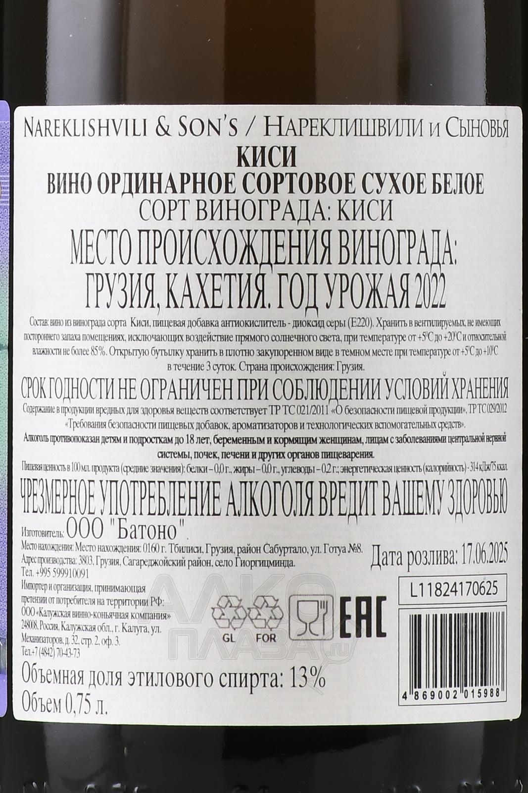 Белое сухое вино Нареклишвили и Сыновья Киси 0,75 л создано из редкого грузинского сорта, который выращивается в регионе Кахетия. Здесь виноградники расположены на аллювиальных почвах с высоким содержанием известняка и глины, что позволяет ягодам сохранять кислотность и выраженную минеральность. Климат региона — континентальный: жаркое лето, прохладные ночи и мягкая осень дают ягодам время для равномерного созревания. Винодельня придерживается традиционных методов производства, но при этом использует современное оборудование для контроля ферментации. Автохтон, урожаи которого используются в качестве сырья, считается сортом с сильным характером, способным дать напиток с многослойным вкусом и выразительным букетом.
