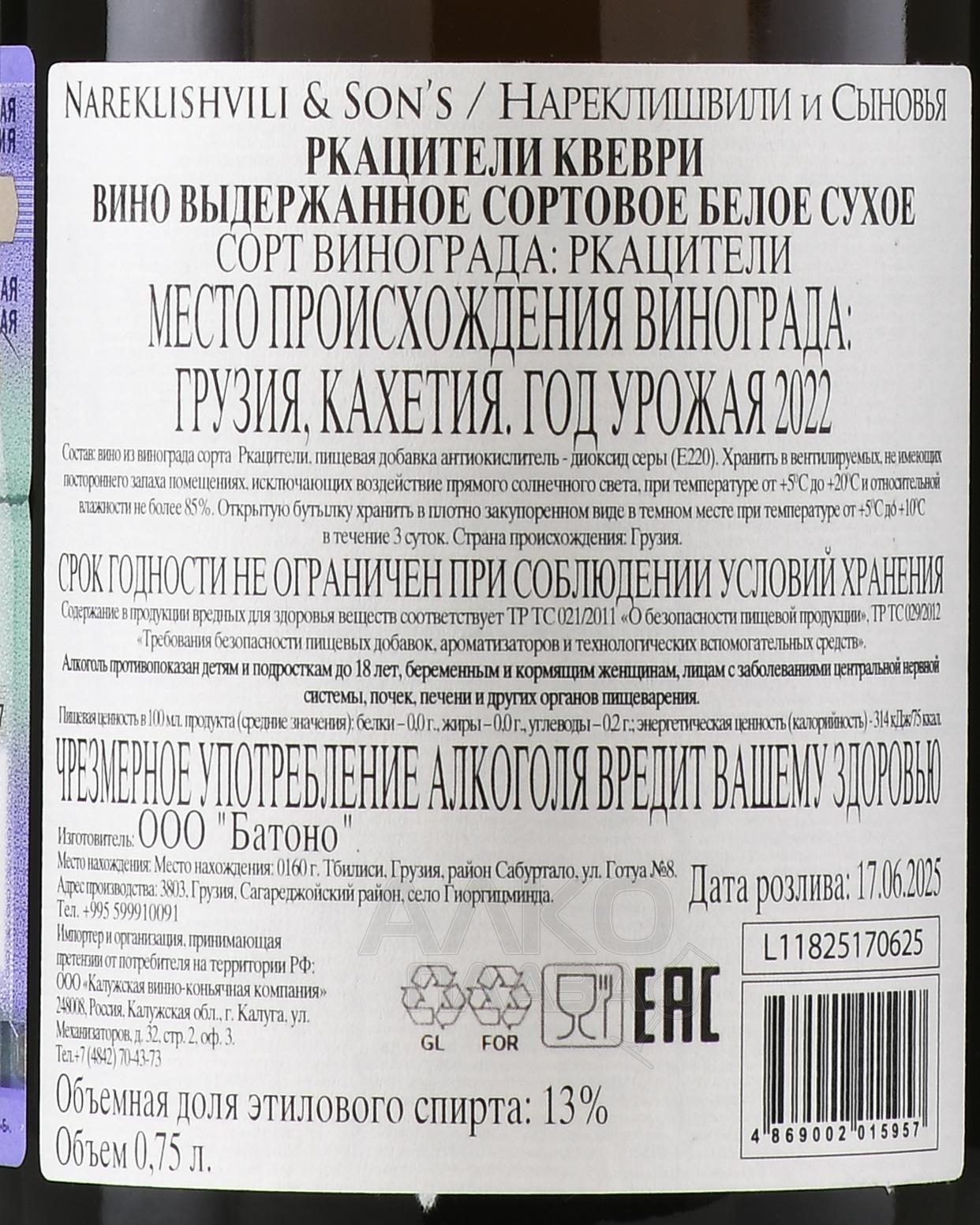 Белое сухое вино Нареклишвили и Сыновья Ркацители Квеври 0,75 л создано в Грузии, в регионе Кахетия, который считается сердцем древнего виноделия. Здесь виноградники расположены на солнечных склонах Алазанской долины, где перепады температур и глинисто-известняковые почвы формируют насыщенный вкус ягод. Напиток производится по традиционной технологии квеври: ферментация и выдержка проходят в больших глиняных сосудах, зарытых в землю. Этот способ позволяет сохранить природные характеристики плодов и придать готовому образцу уникальную глубину.