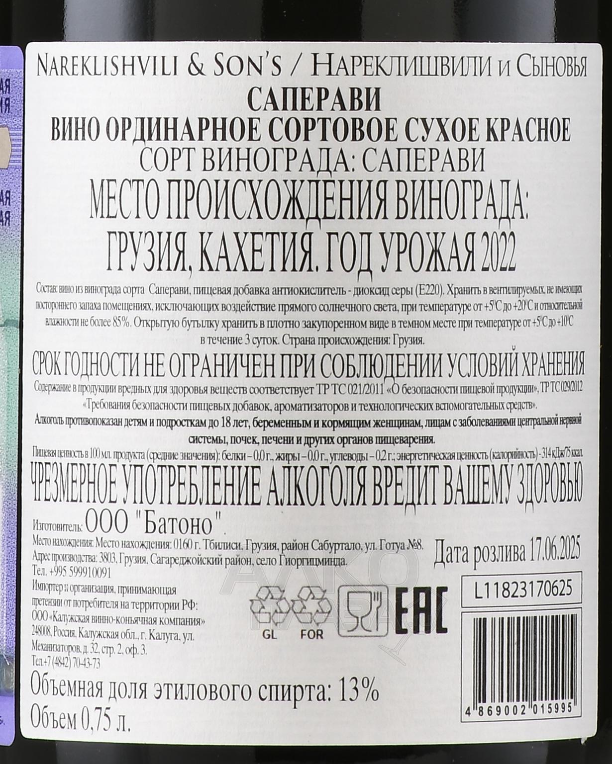 Красное сухое вино Нареклишвили и Сыновья Саперави 0,75 л создано в Грузии, в ведущем винодельческом регионе страны. Сырьем служат ягоды флагманского автохтона, выращенные на аллювиальных и глинисто-галечных почвах. Климат здесь континентальный: жаркое лето и прохладная осень обеспечивают винограду высокий уровень фенольной зрелости и устойчивый баланс кислотности. Урожай собирают вручную, ягоды сортируют, после чего сусло подвергается ферментации в стальных резервуарах с контролем температуры. Такой подход позволяет сохранить естественную структуру и выразительность сорта.